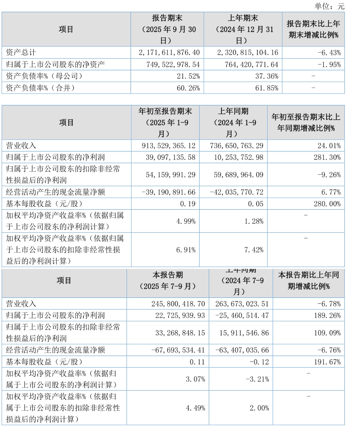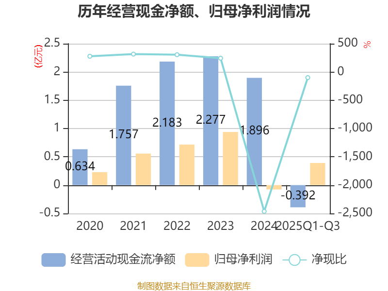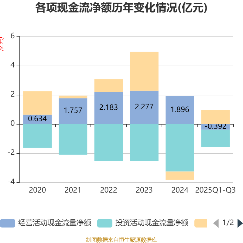 2025年前三季度,公司经营活动现金流净额为-3919.09万元,同比增加284.49万元;筹资活动现金流净额9548.69万元,同比增加3259.13万元;投资活动现金流净额-1.19亿元,上年同期为-1.88亿元。