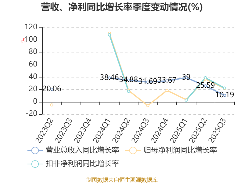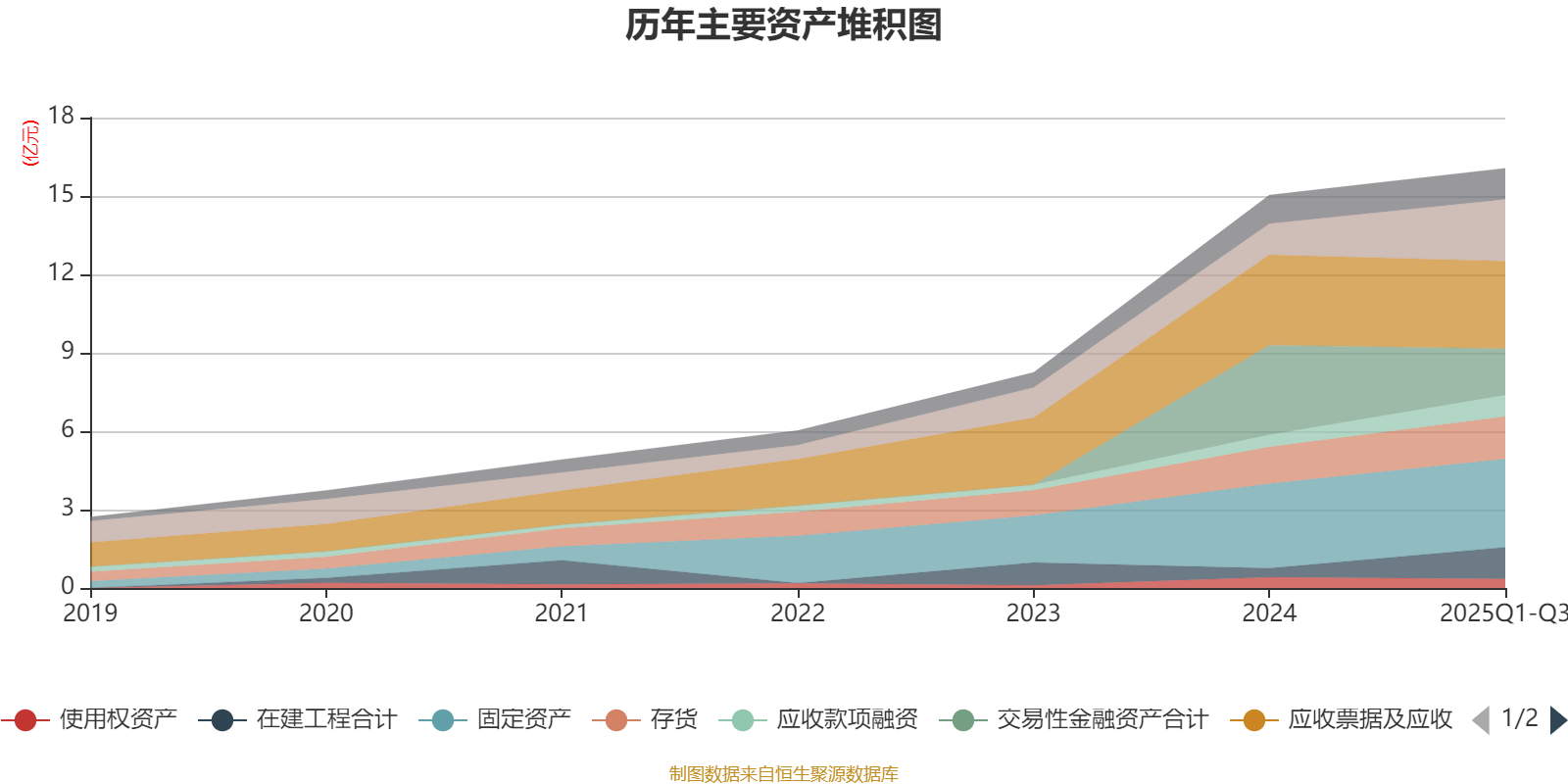 资产重大变化方面,截至2025年三季度末,公司交易性金融资产合计较上年末减少48%,占公司总资产比重下降11.72个百分点;货币资金较上年末增加98.77%,占公司总资产比重上升6.78个百分点;在建工程合计较上年末增加247.25%,占公司总资产比重上升5.21个百分点;应收票据及应收账款较上年末减少3.12%,占公司总资产比重下降2.14个百分点。