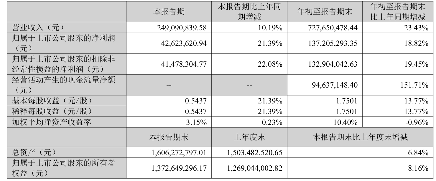 中证智能财讯骏鼎达(301538)10月28日披露2025年第三季度报告。前三季度公司实现营业总收入7.28亿元,同比增长23.43%;归母净利润1.37亿元,同比增长18.82%;扣非净利润1.33亿元,同比增长19.45%;经营活动产生的现金流量净额为9463.71万元,同比增长151.71%;报告期内,骏鼎达基本每股收益为1.7501元,加权平均净资产收益率为10.40%。