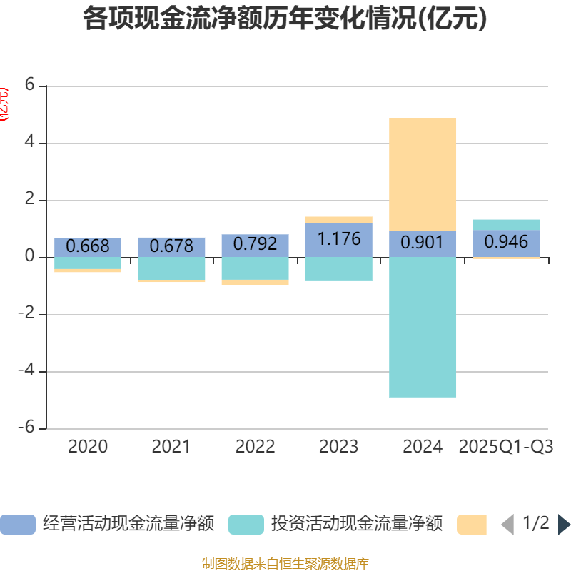 2025年前三季度,公司经营活动现金流净额为9463.71万元,同比增长151.71%;筹资活动现金流净额-721.05万元,同比减少4.15亿元;投资活动现金流净额3636.62万元,上年同期为-4.63亿元。