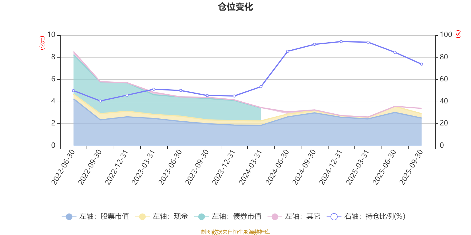 据定期报告数据统计,近三年平均股票仓位为67.92%,同类平均为72.19%。2024年末基金达到94.28%的最高仓位,2022年三季度末最低,为40.58%。