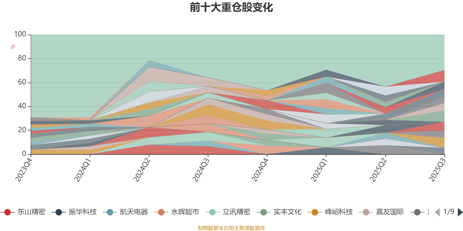 截至2025年三季度末,基金十大重仓股分别是国博电子、寒武纪、青木科技、佰维存储、中科曙光、晶合集成、华虹半导体、开普云、德明利、鹏辉能源。