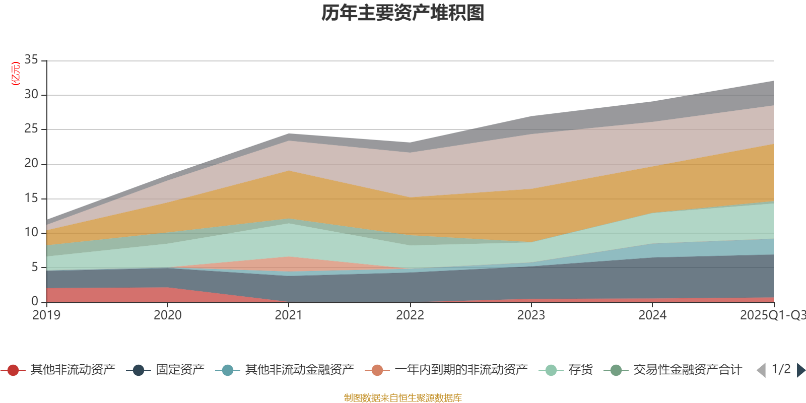 资产重大变化方面,截至2025年三季度末,公司货币资金较上年末减少13.68%,占公司总资产比重下降4.83个百分点;应收票据及应收账款较上年末增加23.16%,占公司总资产比重上升2.7个百分点;交易性金融资产合计较上年末增加1172.09%,占公司总资产比重上升1个百分点;固定资产较上年末增加5.12%,占公司总资产比重下降0.96个百分点。