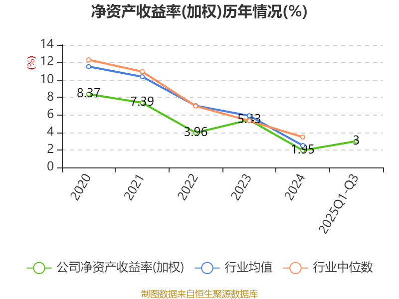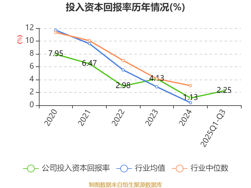 盈利能力方面, 2025年前三季度公司加权平均净资产收益率为3%,同比下降0.15个百分点。公司2025年前三季度投入资本回报率为2.25%,较上年同期下降0.19个百分点。