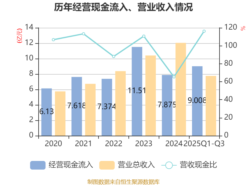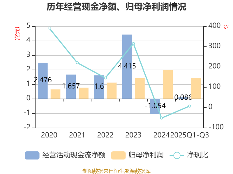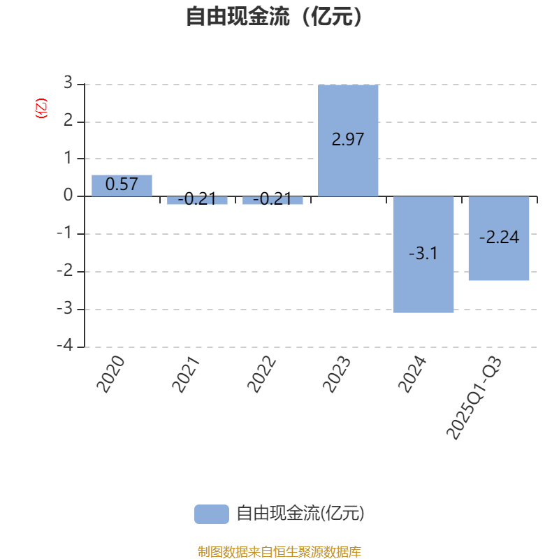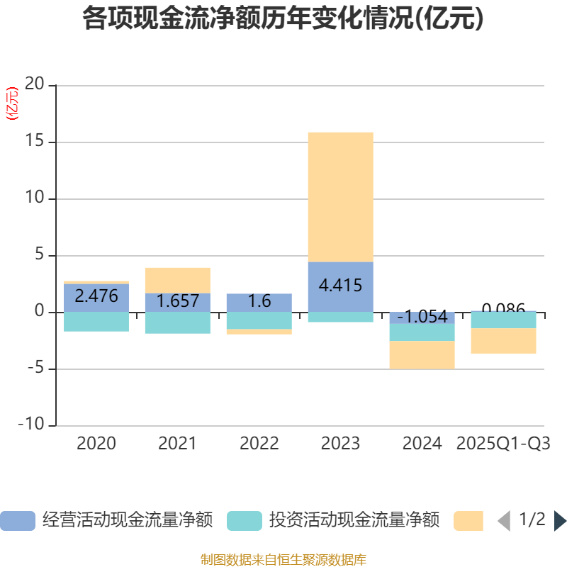 2025年前三季度,公司经营活动现金流净额为862.98万元,同比增加3.47亿元;筹资活动现金流净额-2.24亿元,同比增加2375.93万元;投资活动现金流净额-1.45亿元,上年同期为-1.41亿元。