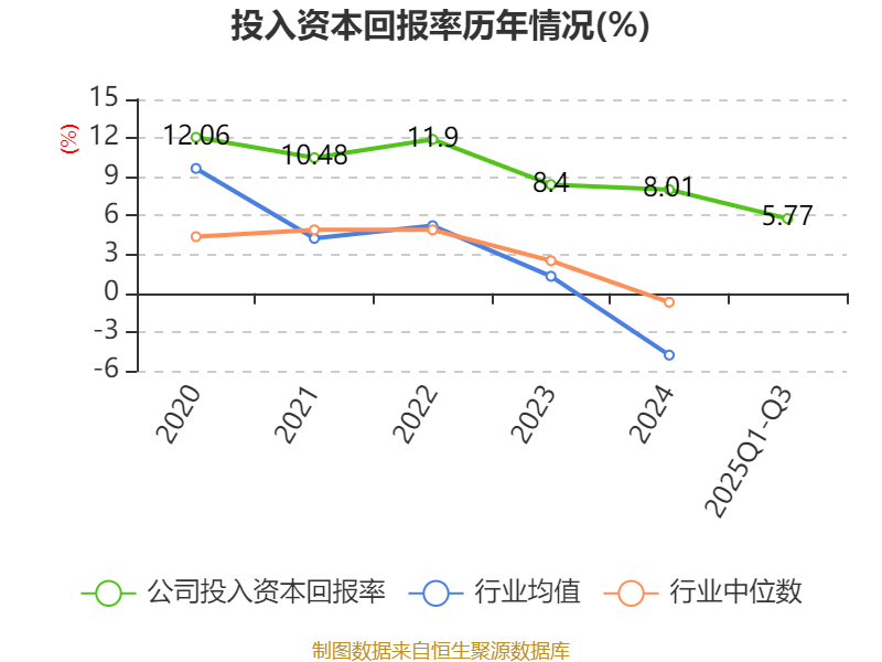 盈利能力方面, 2025年前三季度公司加权平均净资产收益率为6.29%,同比下降0.41个百分点。公司2025年前三季度投入资本回报率为5.77%,较上年同期下降0.28个百分点。