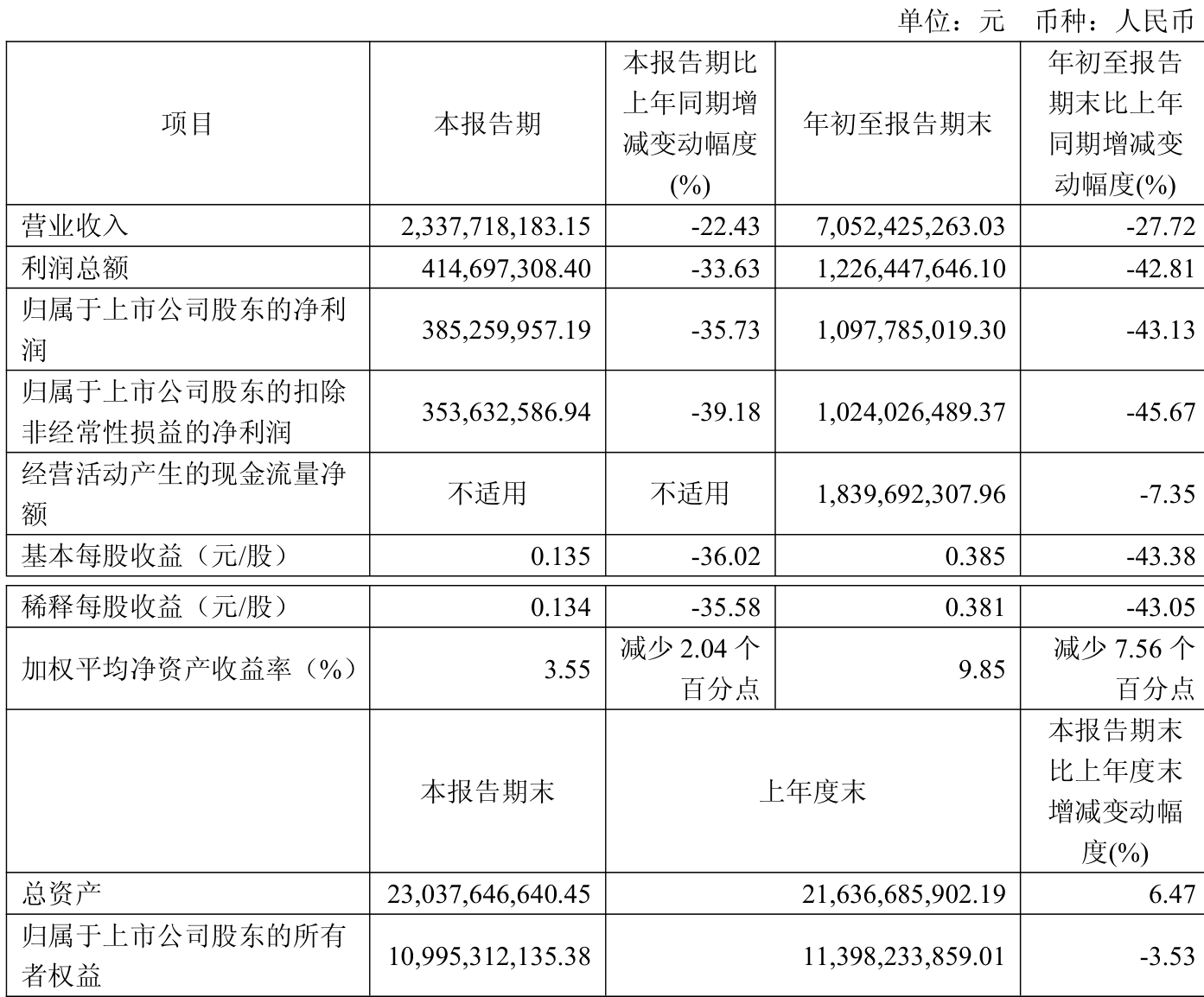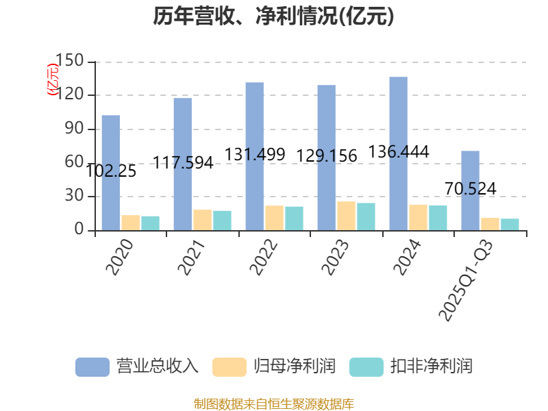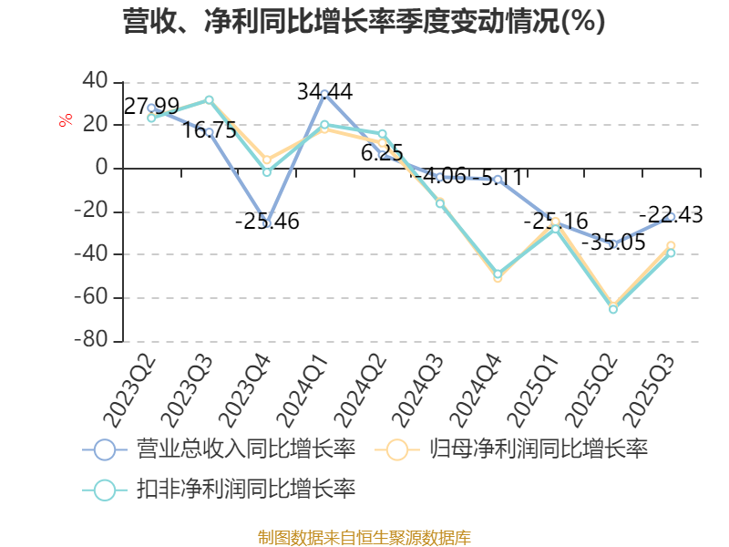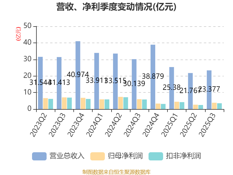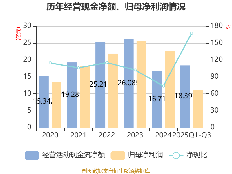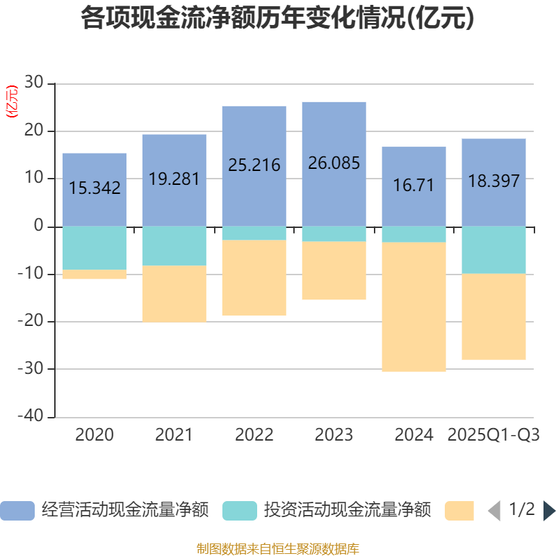 2025年前三季度,公司经营活动现金流净额为18.4亿元,同比下降7.35%;筹资活动现金流净额-18.07亿元,同比增加9.54亿元;投资活动现金流净额-9.93亿元,上年同期为-1.95亿元。