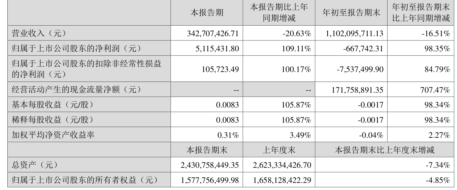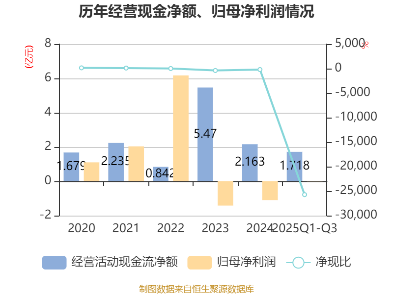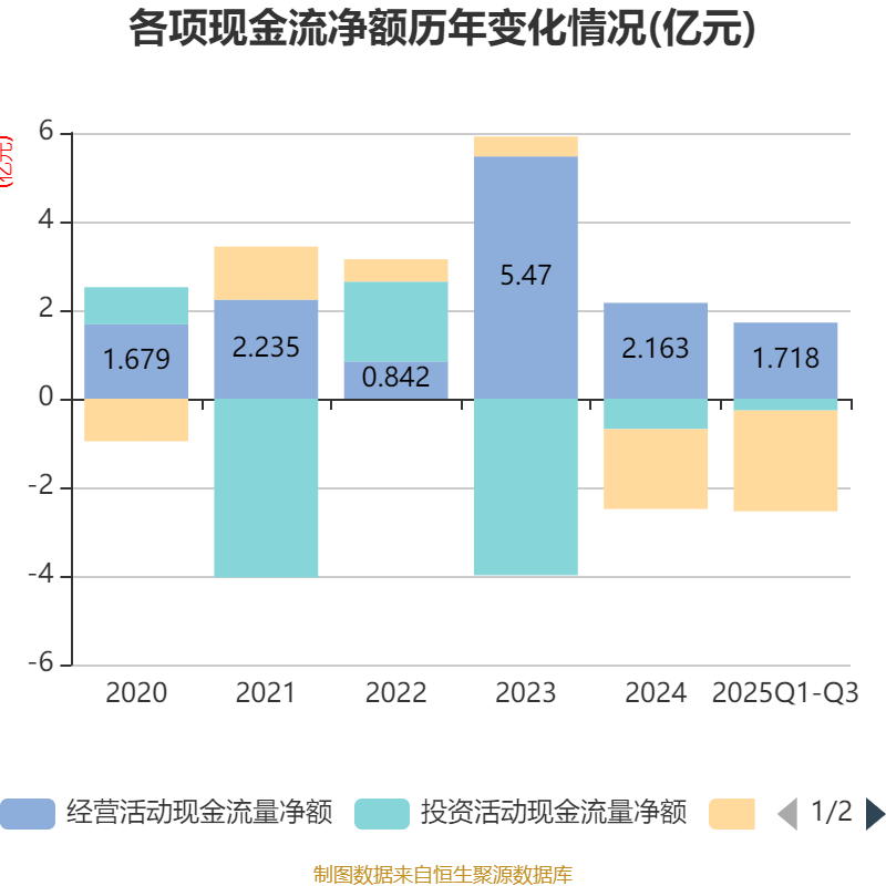 2025年前三季度,公司经营活动现金流净额为1.72亿元,同比增加2亿元;筹资活动现金流净额-2.28亿元,同比减少1.28亿元;投资活动现金流净额-2661.7万元,上年同期为-4850.49万元。
