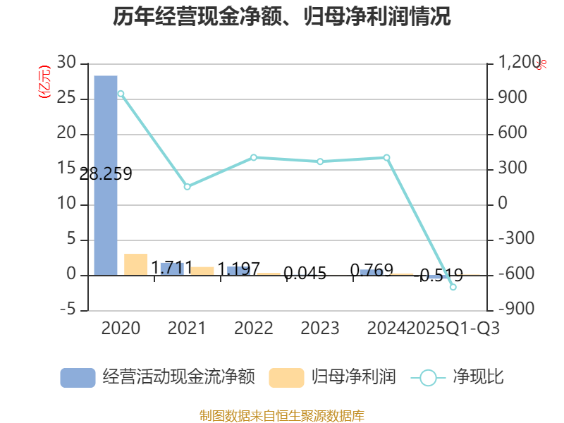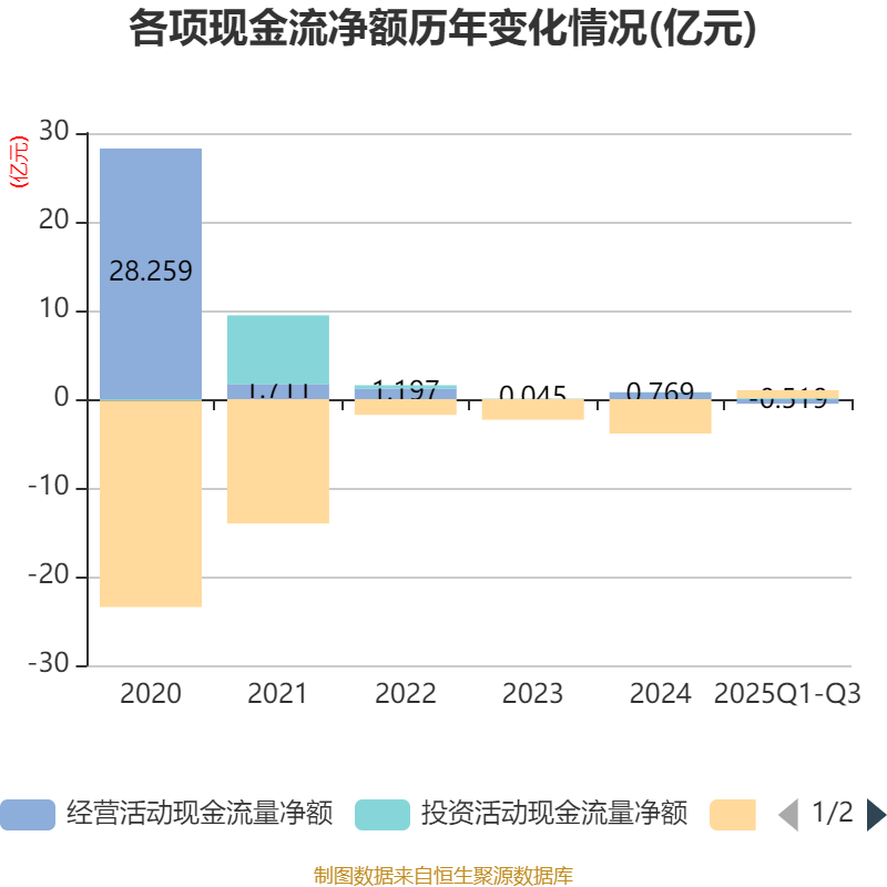 2025年前三季度,公司经营活动现金流净额为-5185.46万元,同比减少2660.55万元;筹资活动现金流净额8963.03万元,同比增加4.26亿元;投资活动现金流净额1102.67万元,上年同期为721.72万元。