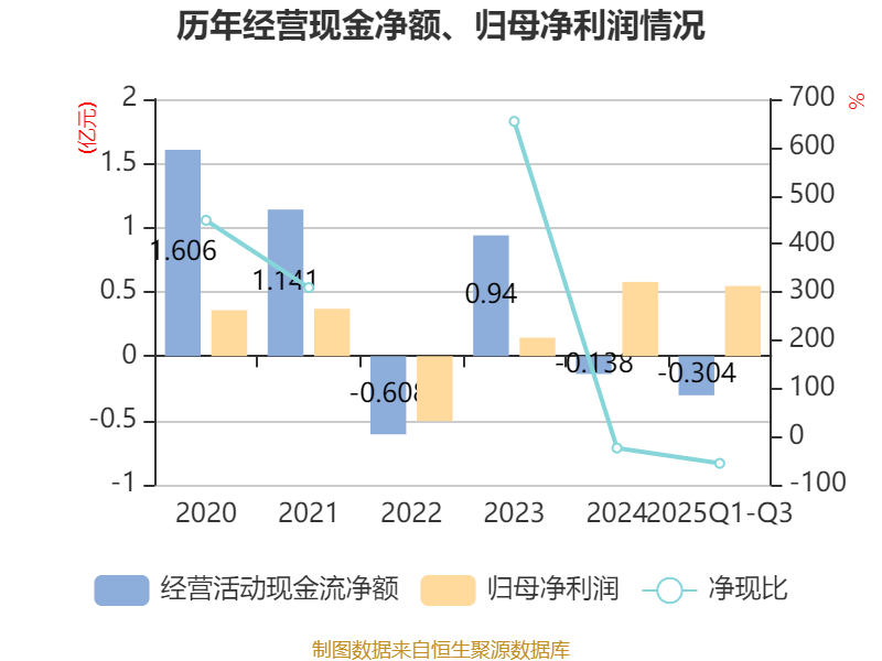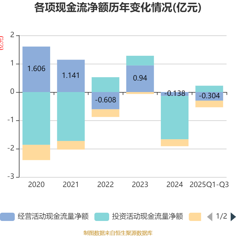 2025年前三季度,公司经营活动现金流净额为-3037.64万元,同比增加9197.87万元;筹资活动现金流净额-2335.39万元,同比减少2298.6万元;投资活动现金流净额2240.36万元,上年同期为-1.08亿元。