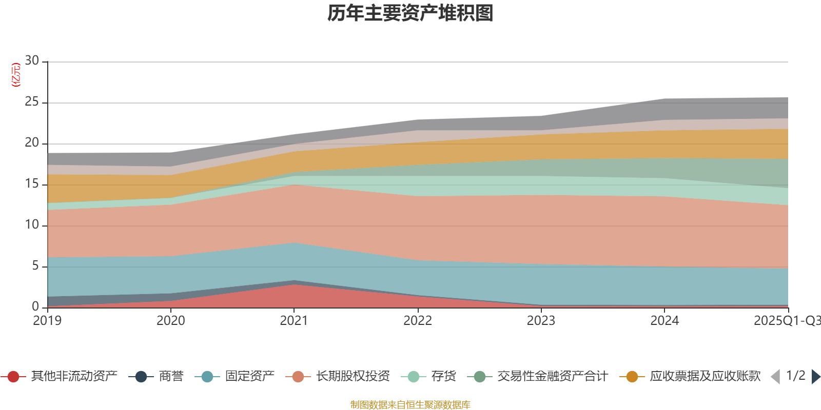 资产重大变化方面,截至2025年三季度末,公司交易性金融资产合计较上年末增加46.31%,占公司总资产比重上升4.35个百分点;长期股权投资较上年末减少9.81%,占公司总资产比重下降3.48个百分点;固定资产较上年末减少5.51%,占公司总资产比重下降1.12个百分点;应收票据及应收账款较上年末增加8.13%,占公司总资产比重上升0.99个百分点。