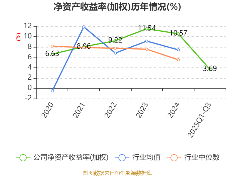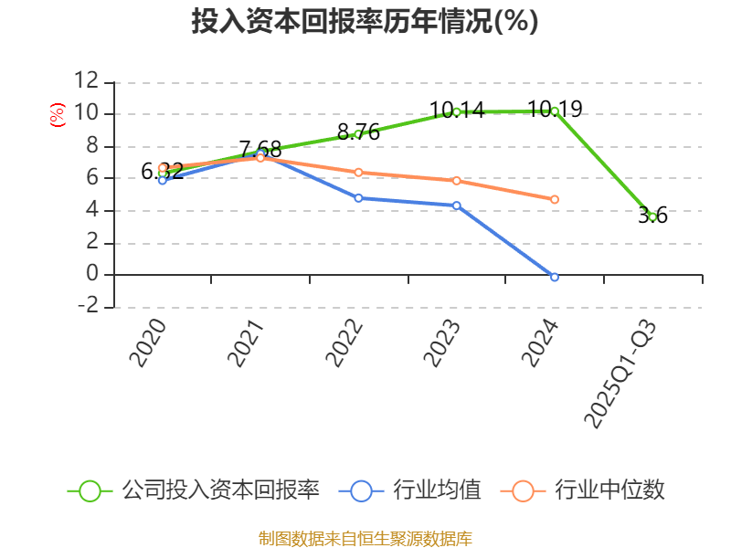 盈利能力方面, 2025年前三季度公司加权平均净资产收益率为3.69%,同比下降2.74个百分点。公司2025年前三季度投入资本回报率为3.6%,较上年同期下降2.61个百分点。