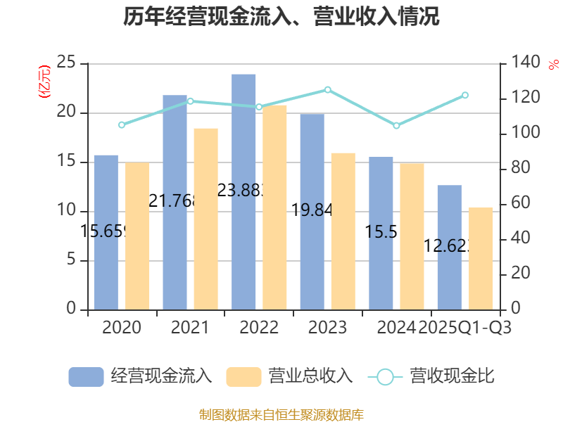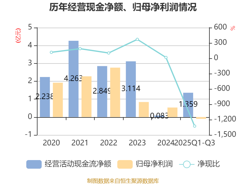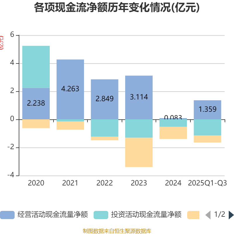 2025年前三季度,公司经营活动现金流净额为1.36亿元,同比增长467.13%;筹资活动现金流净额-5067.77万元,同比增加3445.51万元;投资活动现金流净额-1.14亿元,上年同期为-6107.83万元。
