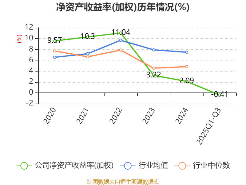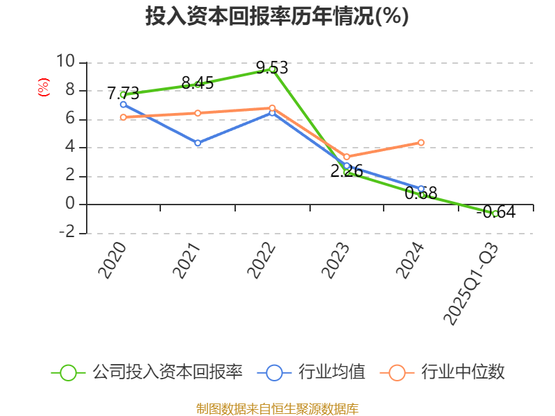 盈利能力方面, 2025年前三季度公司加权平均净资产收益率为-0.41%,同比下降2.23个百分点。公司2025年前三季度投入资本回报率为-0.64%,较上年同期下降1.75个百分点。