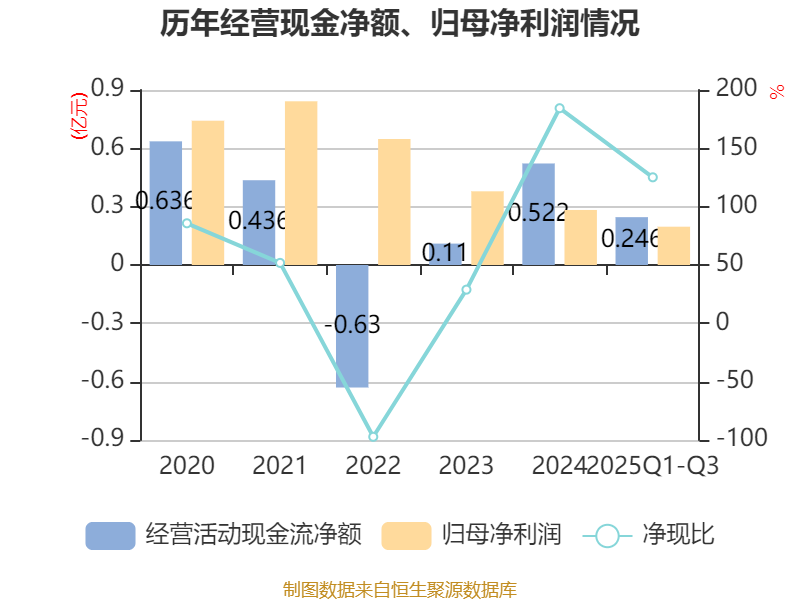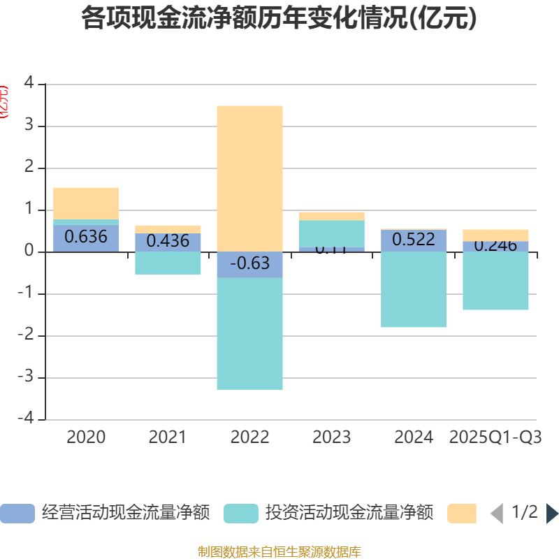 2025年前三季度,公司经营活动现金流净额为2464.53万元,同比下降38.9%;筹资活动现金流净额2789.27万元,同比增加3007.9万元;投资活动现金流净额-1.39亿元,上年同期为-1.4亿元。
