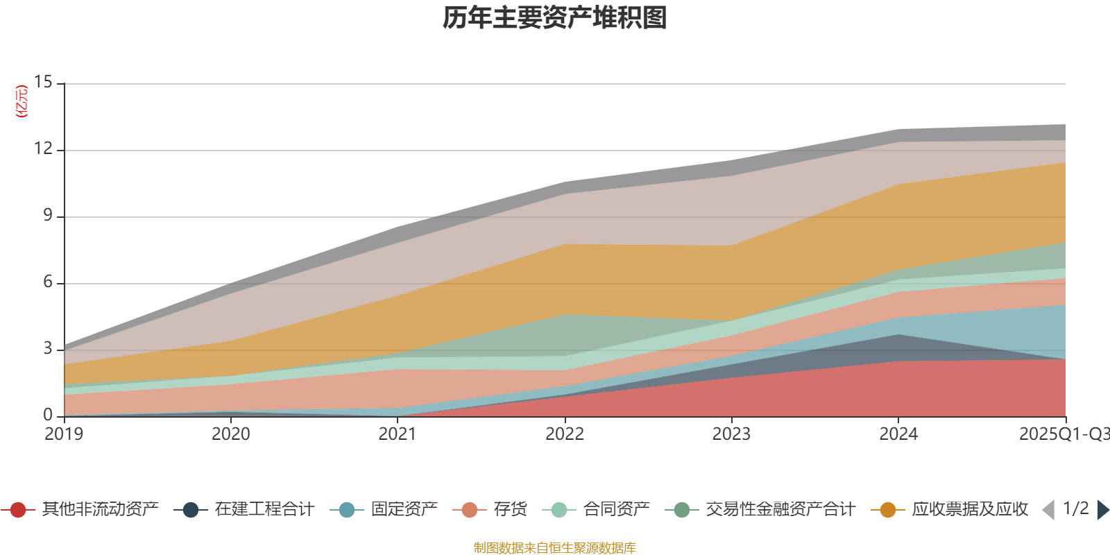 资产重大变化方面,截至2025年三季度末,公司固定资产较上年末增加223.32%,占公司总资产比重上升12.77个百分点;在建工程合计较上年末减少99.4%,占公司总资产比重下降9.32个百分点;货币资金较上年末减少47.16%,占公司总资产比重下降7.05个百分点;交易性金融资产合计较上年末增加162.4%,占公司总资产比重上升5.43个百分点。