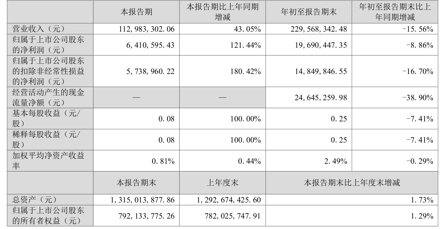 中证智能财讯楚环科技(001336)10月28日披露2025年第三季度报告。前三季度公司实现营业总收入2.3亿元,同比下降15.56%;归母净利润1969.04万元,同比下降8.86%;扣非净利润1484.98万元,同比下降16.70%;经营活动产生的现金流量净额为2464.53万元,同比下降38.90%;报告期内,楚环科技基本每股收益为0.25元,加权平均净资产收益率为2.49%。