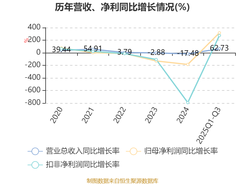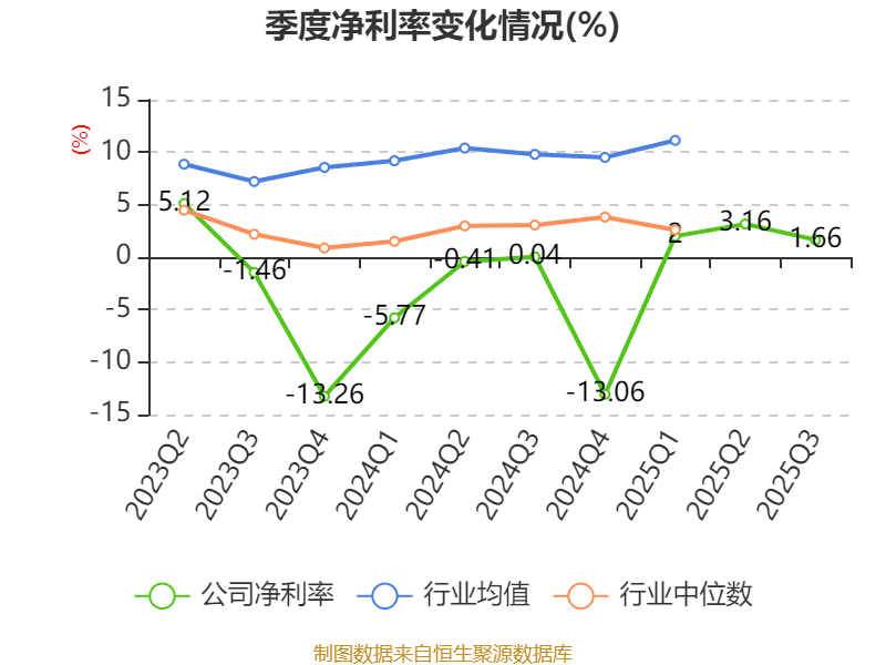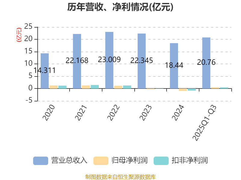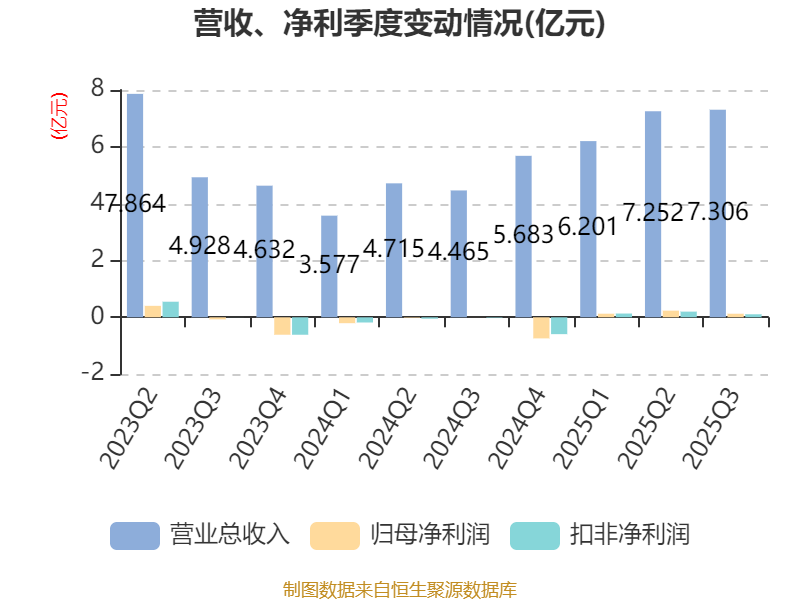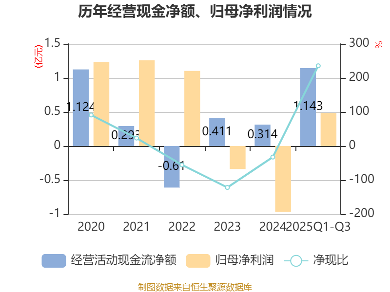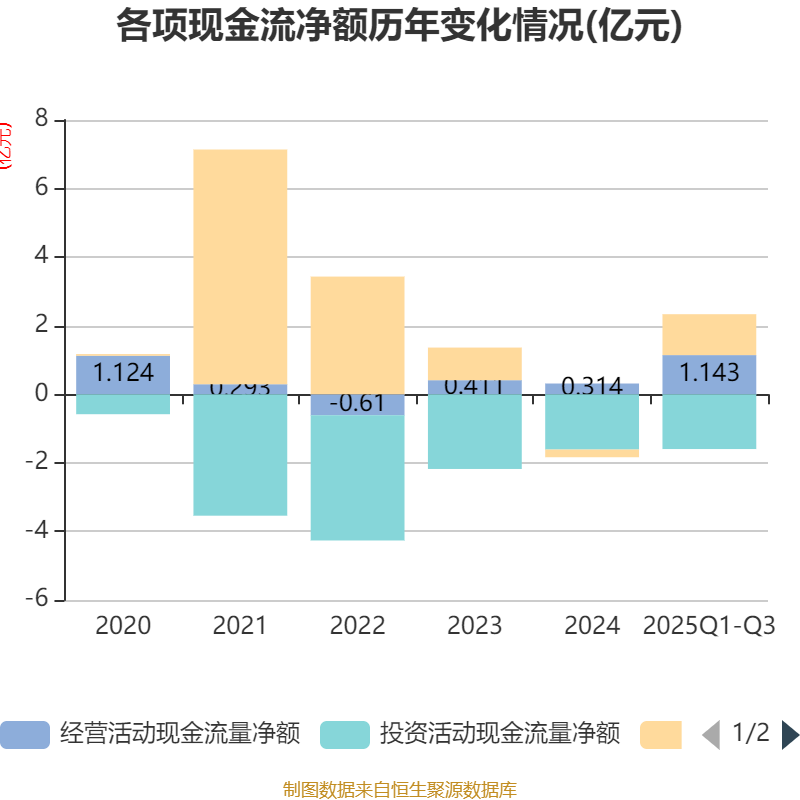 2025年前三季度,公司经营活动现金流净额为1.14亿元,同比增加2.93亿元;筹资活动现金流净额1.19亿元,同比减少1.21亿元;投资活动现金流净额-1.6亿元,上年同期为-1.08亿元。