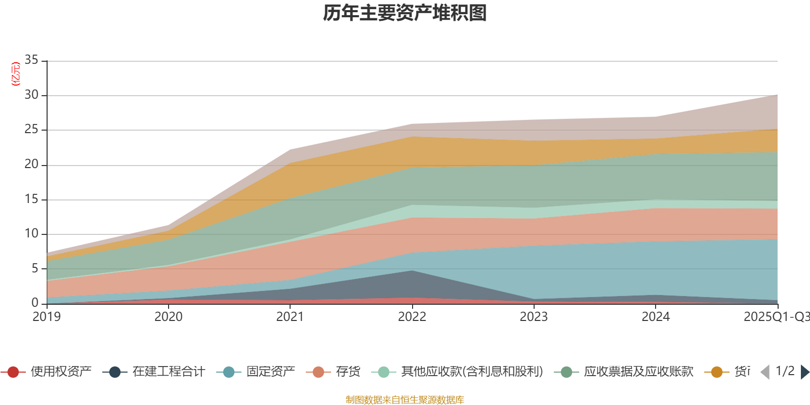 资产重大变化方面,截至2025年三季度末,公司存货较上年末减少7.8%,占公司总资产比重下降3.13个百分点;货币资金较上年末增加51.13%,占公司总资产比重上升2.9个百分点;应收款项融资较上年末增加14528%,占公司总资产比重上升2.79个百分点;交易性金融资产合计占公司总资产的2.66%,上年末为0。