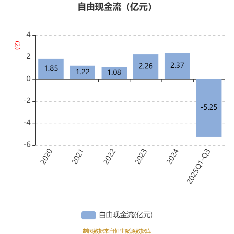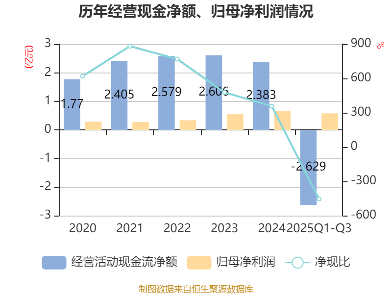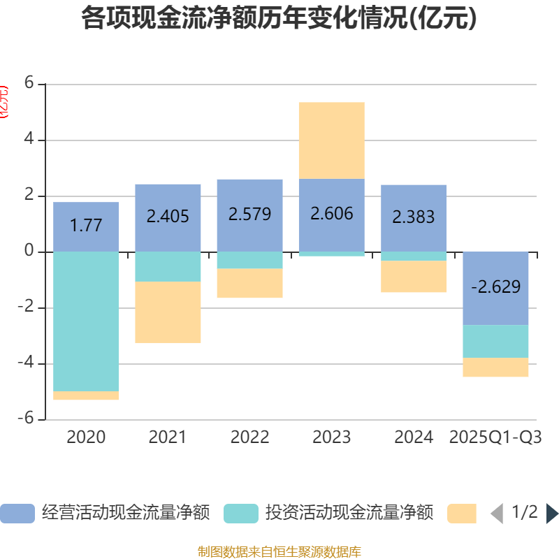 2025年前三季度,公司经营活动现金流净额为-2.63亿元,同比减少6383.56万元;筹资活动现金流净额-6804.84万元,同比增加3411.21万元;投资活动现金流净额-1.17亿元,上年同期为-972.96万元。