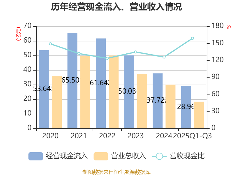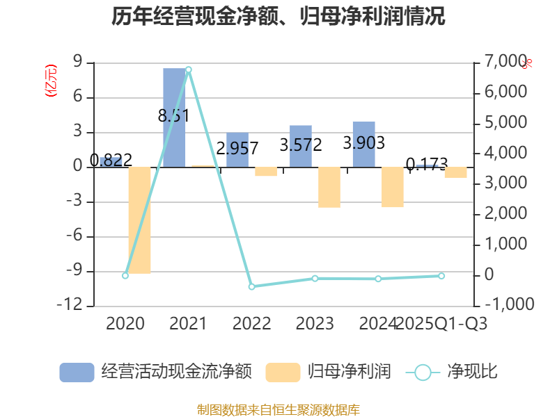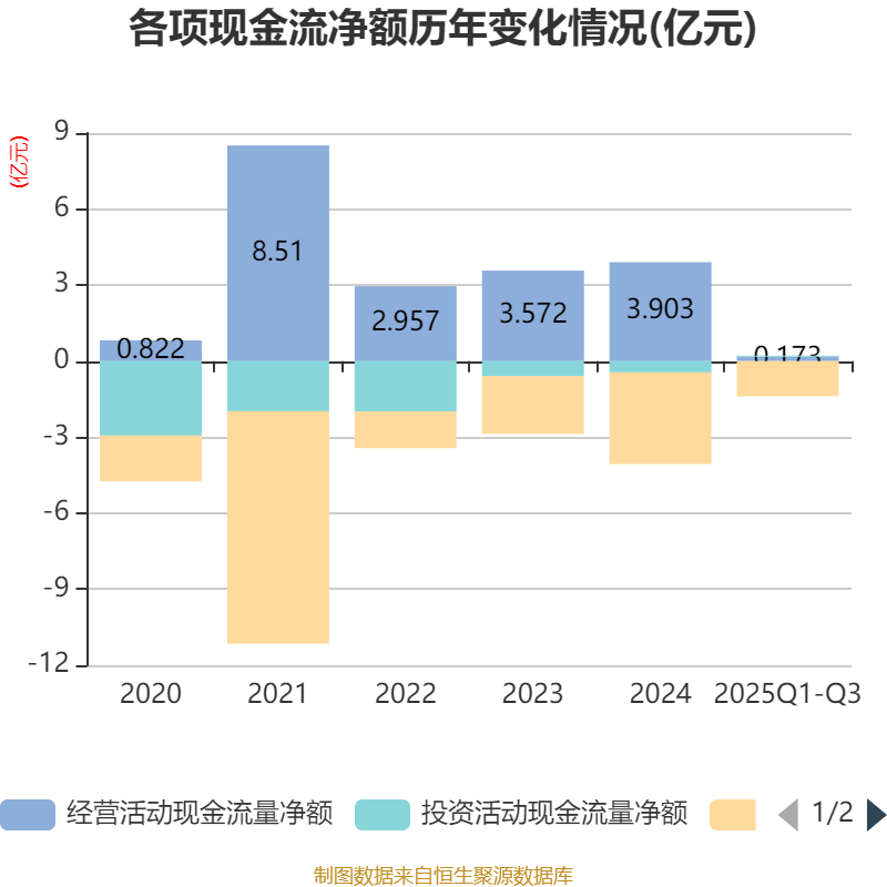 2025年前三季度,公司经营活动现金流净额为1731.95万元,同比下降82.53%;筹资活动现金流净额-1.39亿元,同比减少348.38万元;投资活动现金流净额431.17万元,上年同期为-2931.18万元。