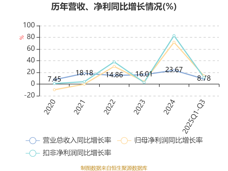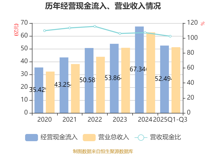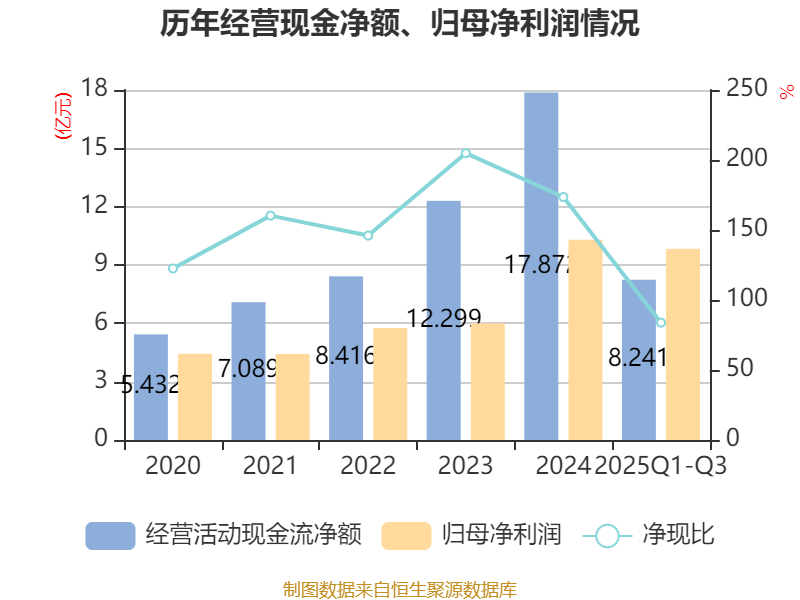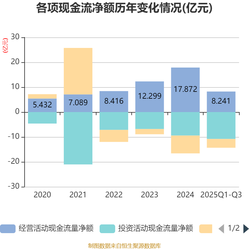 2025年前三季度,公司经营活动现金流净额为8.24亿元,同比下降40.71%;筹资活动现金流净额-3.52亿元,同比增加1.78亿元;投资活动现金流净额-10.81亿元,上年同期为-13.83亿元。