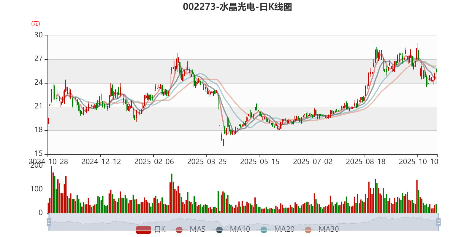 以10月27日收盘价计算,水晶光电目前市盈率(TTM)约为30.66倍,市净率(LF)约3.68倍,市销率(TTM)约5.28倍。
