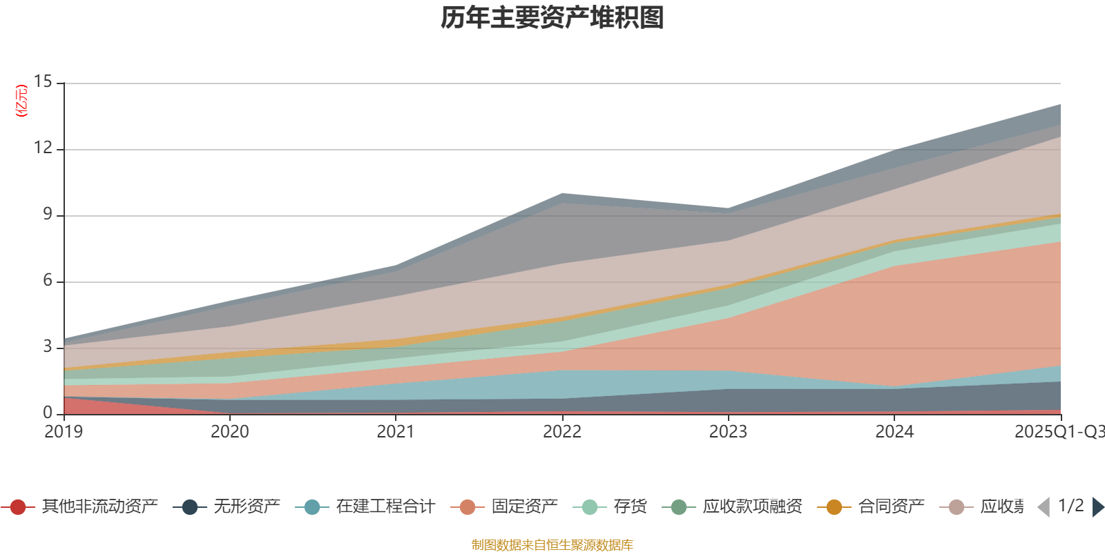 资产重大变化方面,截至2025年三季度末,公司固定资产较上年末增加2.88%,占公司总资产比重下降5.62个百分点;应收票据及应收账款较上年末增加51.16%,占公司总资产比重上升5.54个百分点;货币资金较上年末减少43.94%,占公司总资产比重下降4.19个百分点;在建工程合计较上年末增加507.04%,占公司总资产比重上升4.13个百分点。