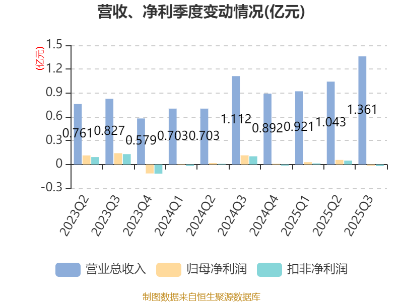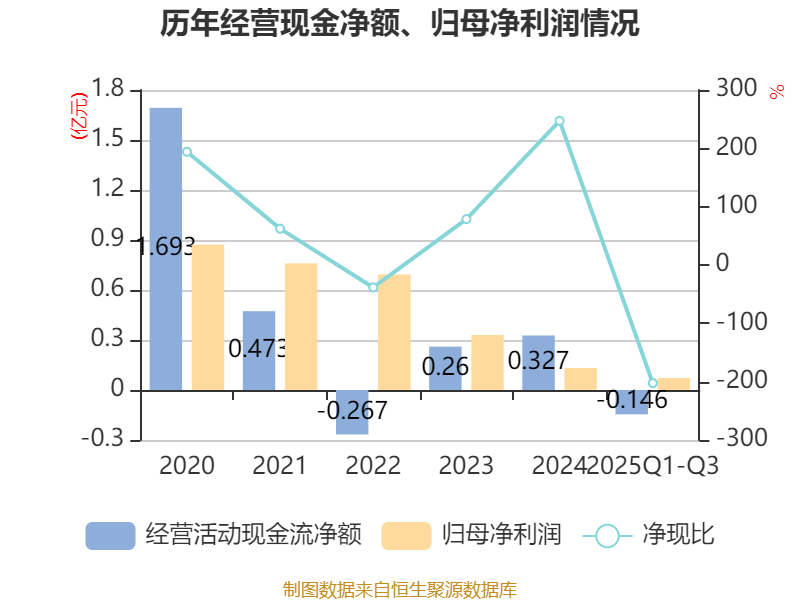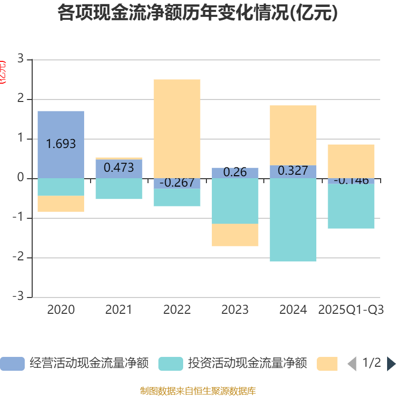 2025年前三季度,公司经营活动现金流净额为-1458.65万元,同比减少6897.77万元;筹资活动现金流净额8498.32万元,同比增加847.13万元;投资活动现金流净额-1.13亿元,上年同期为-1.96亿元。