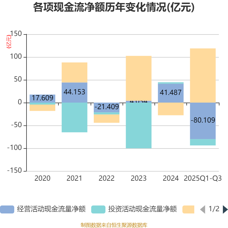 2025年前三季度,公司经营活动现金流净额为-80.11亿元,同比减少67.34亿元;筹资活动现金流净额118.82亿元,同比增加51.69亿元;投资活动现金流净额-13.83亿元,上年同期为-27.92亿元。