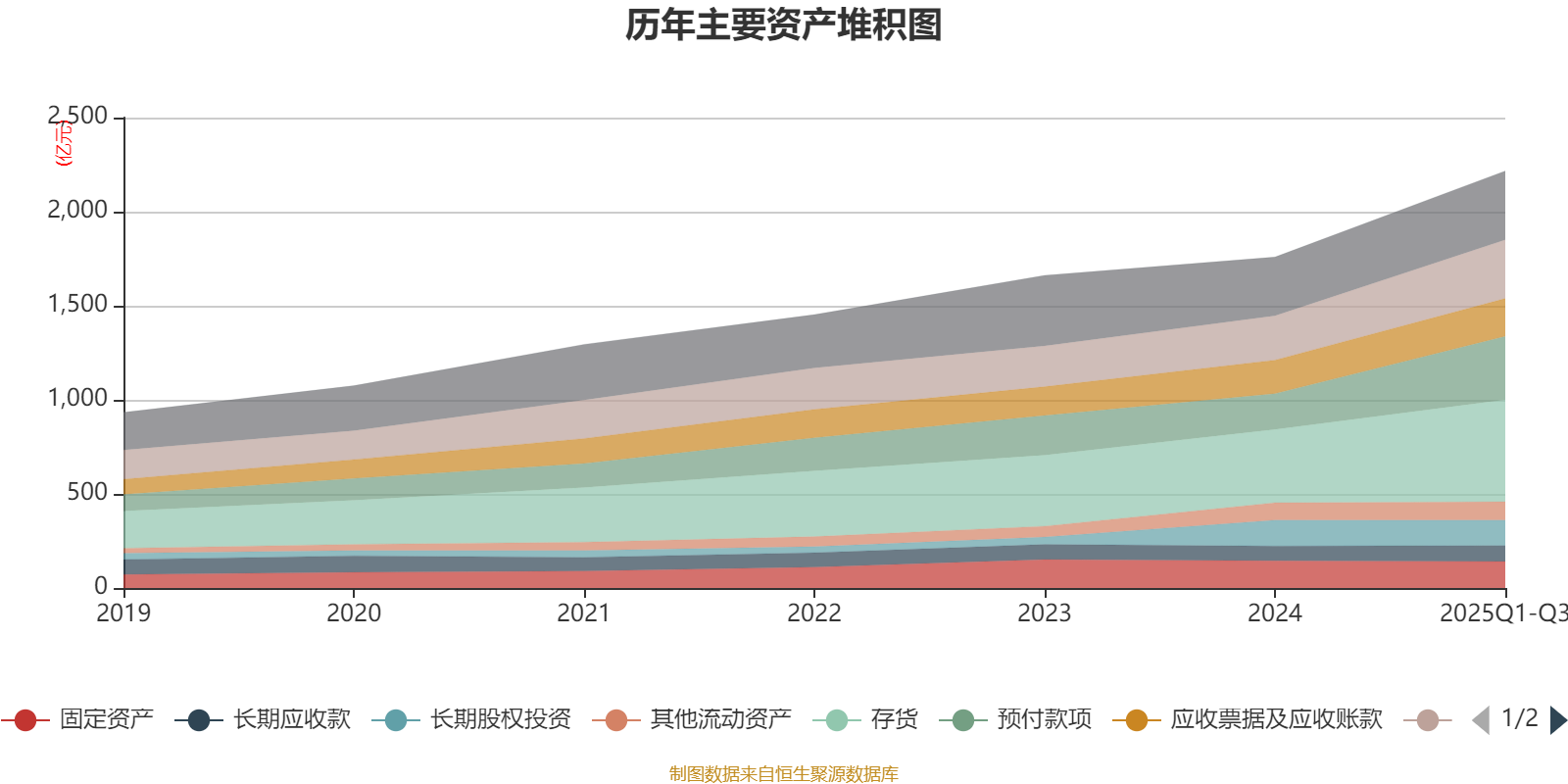 资产重大变化方面,截至2025年三季度末,公司预付款项较上年末增加76.98%,占公司总资产比重上升4.38个百分点;存货较上年末增加39.39%,占公司总资产比重上升2.34个百分点;固定资产较上年末减少2.54%,占公司总资产比重下降1.86个百分点;长期股权投资较上年末减少2.66%,占公司总资产比重下降1.79个百分点。