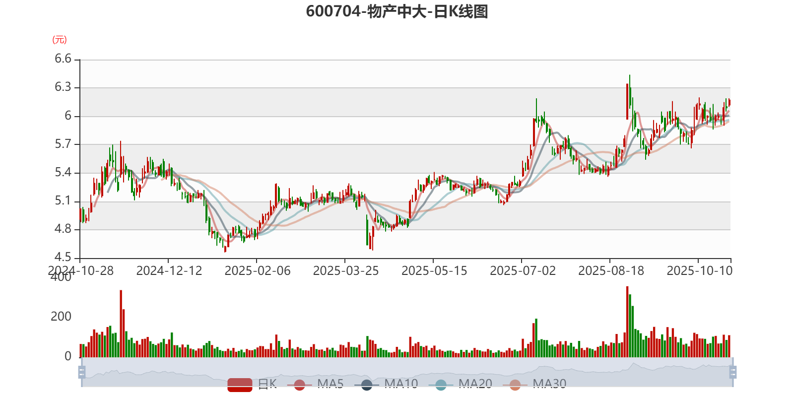 中证智能财讯物产中大(600704)10月28日披露2025年第三季度报告。前三季度公司实现营业总收入4329.79亿元,同比下降2.03%;归母净利润30.51亿元,同比增长30.87%;扣非净利润24.66亿元,同比增长23.57;经营活动产生的现金流量净额为-80.11亿元,上年同期为-12.77亿元;报告期内,物产中大基本每股收益为0.58元,加权平均净资产收益率为7.38%。