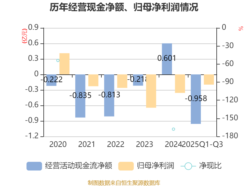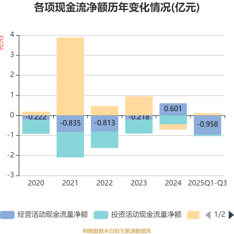 2025年前三季度,公司经营活动现金流净额为-9584.34万元,同比减少3354.51万元;筹资活动现金流净额1081.88万元,同比增加4604.99万元;投资活动现金流净额-800.63万元,上年同期为679.61万元。
