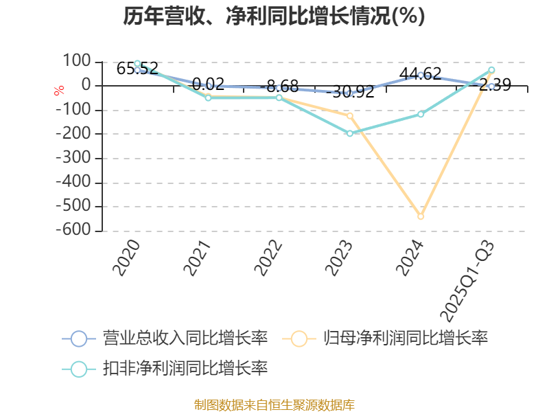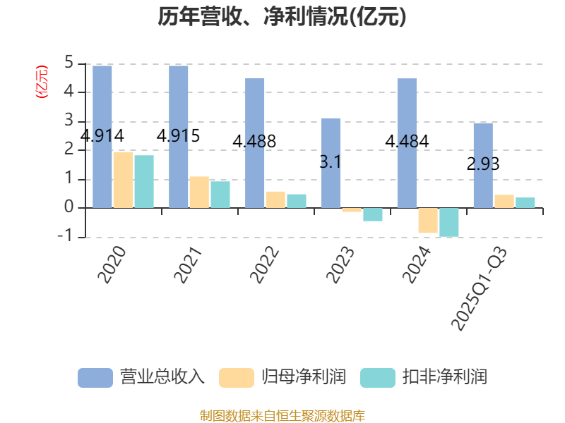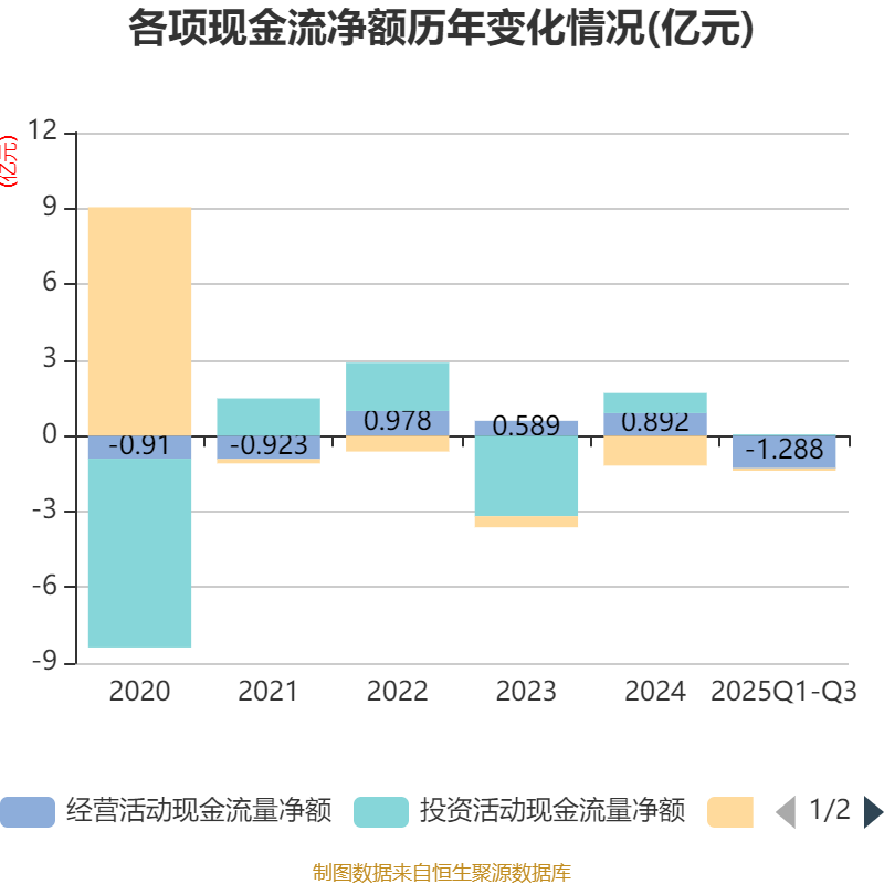 2025年前三季度,公司经营活动现金流净额为-1.29亿元,同比减少1.02亿元;筹资活动现金流净额-986.9万元,同比增加9739.59万元;投资活动现金流净额492.01万元,上年同期为6764.28万元。