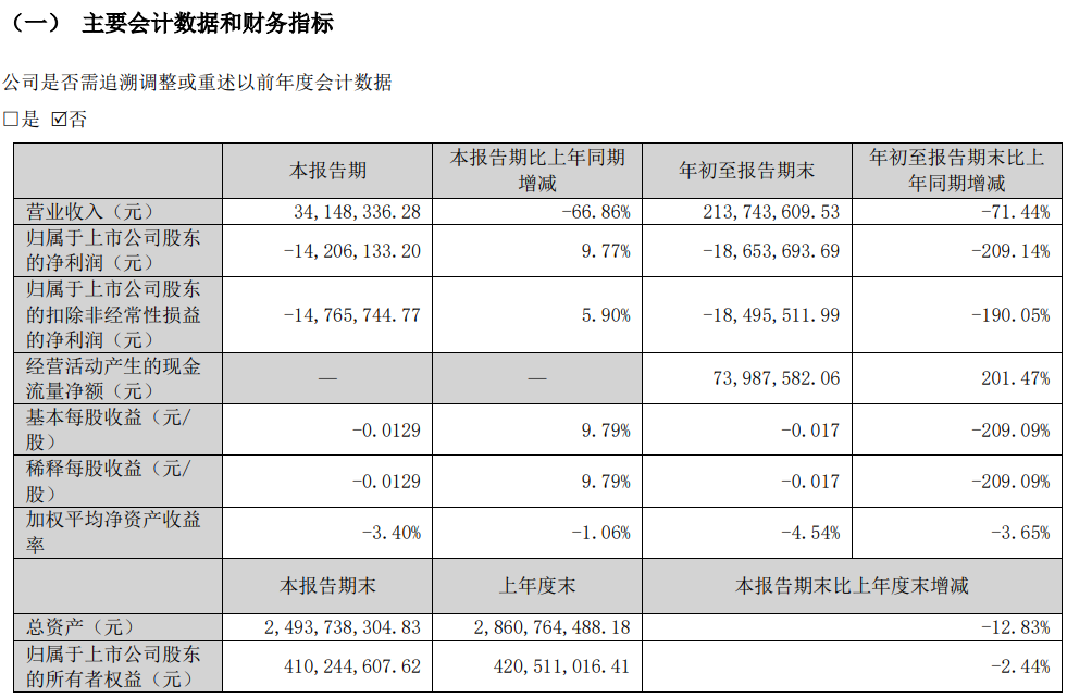 其中,第三季度营业收入为3414.83万元,同比下降66.86%;归属于上市公司股东的净利润为-1420.6万元,同比增长9.77%。