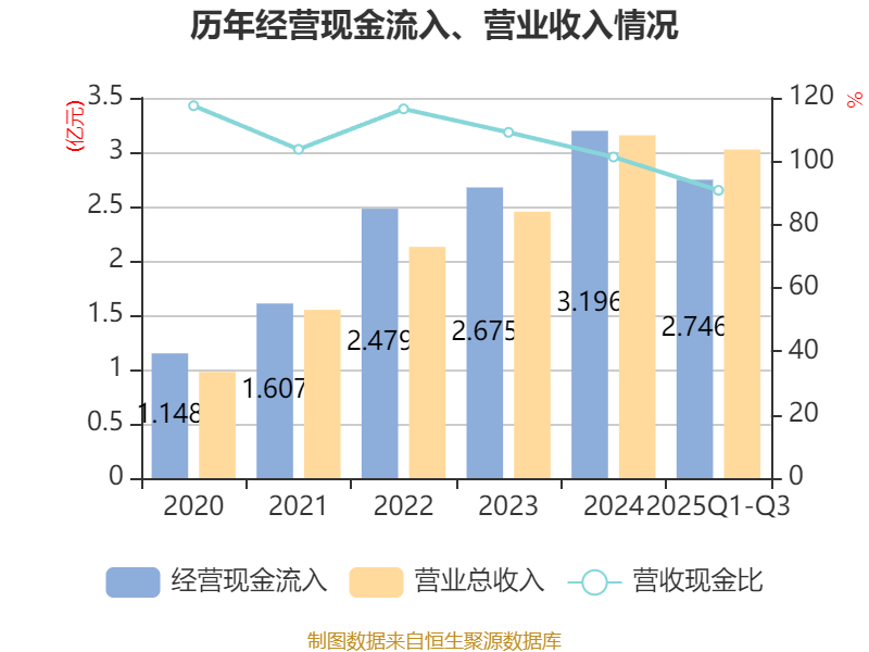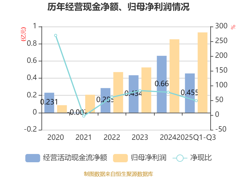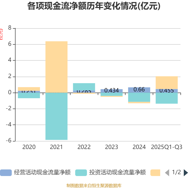 2025年前三季度,公司经营活动现金流净额为4545.6万元,同比下降16.34%;筹资活动现金流净额1.58亿元,同比增加1.65亿元;投资活动现金流净额-1.37亿元,上年同期为-1.22亿元。