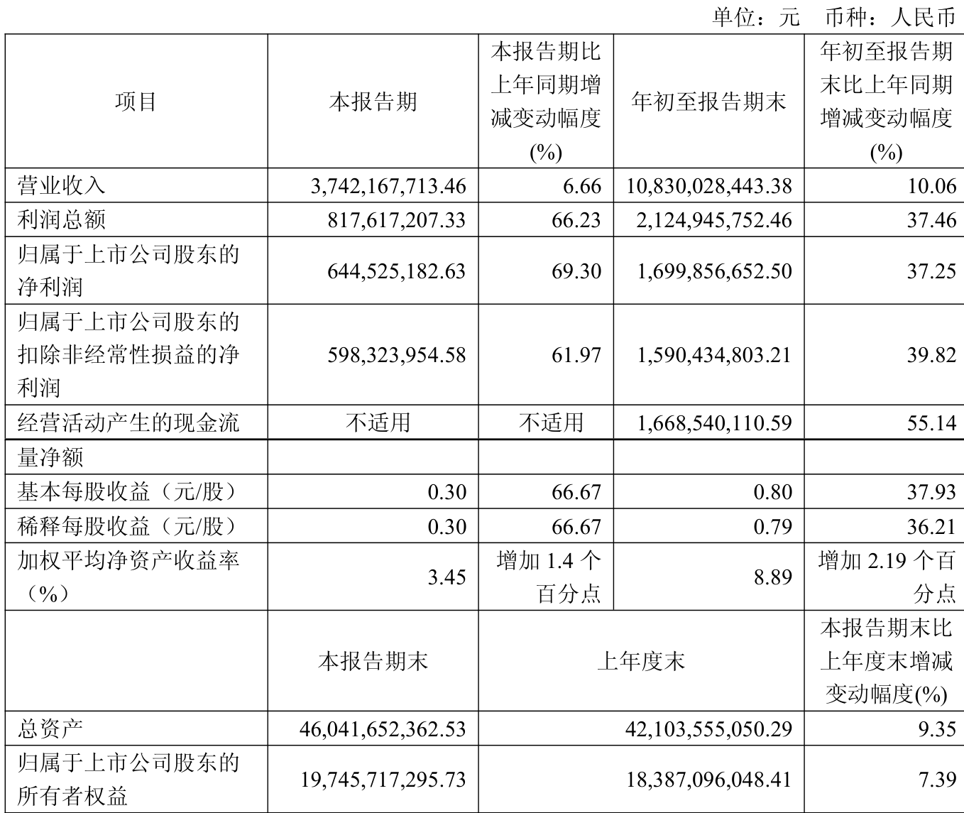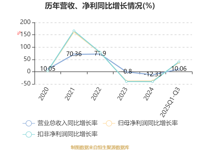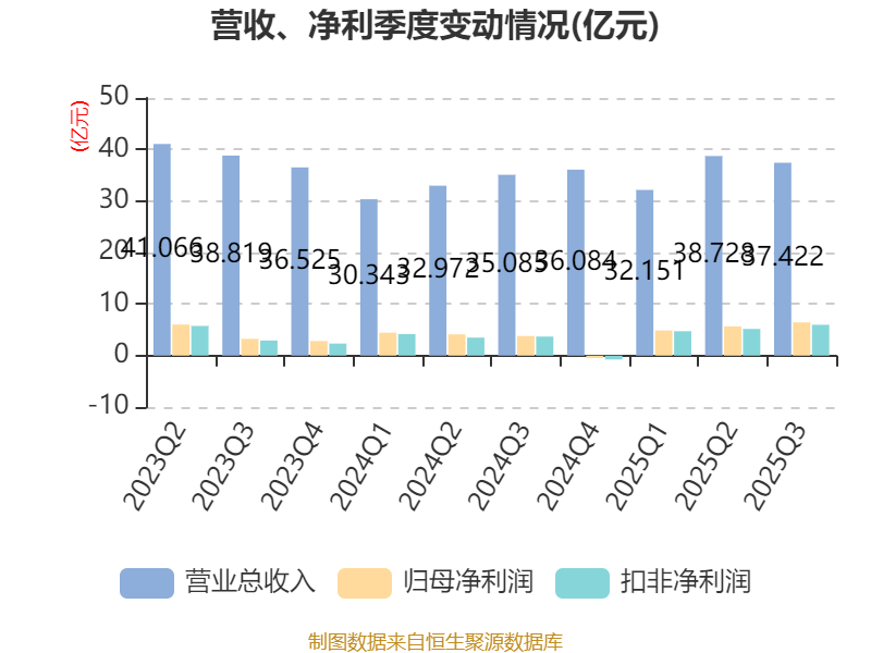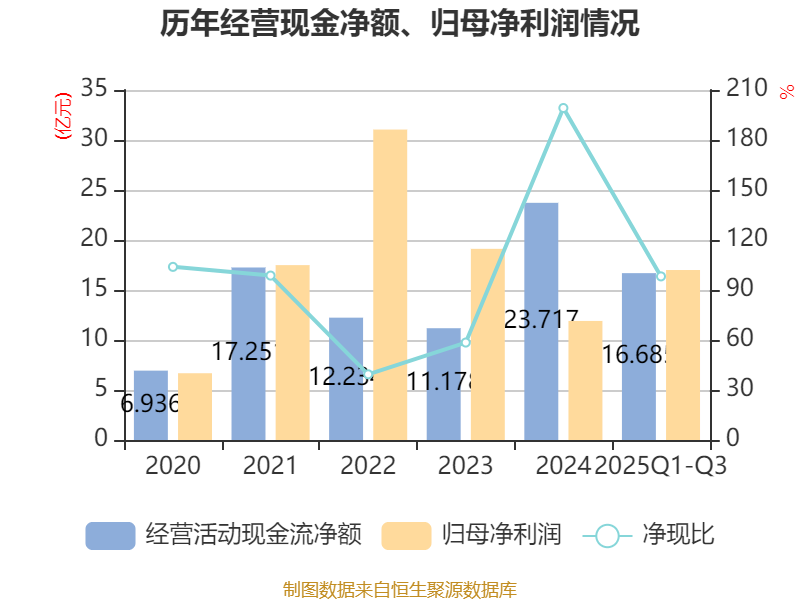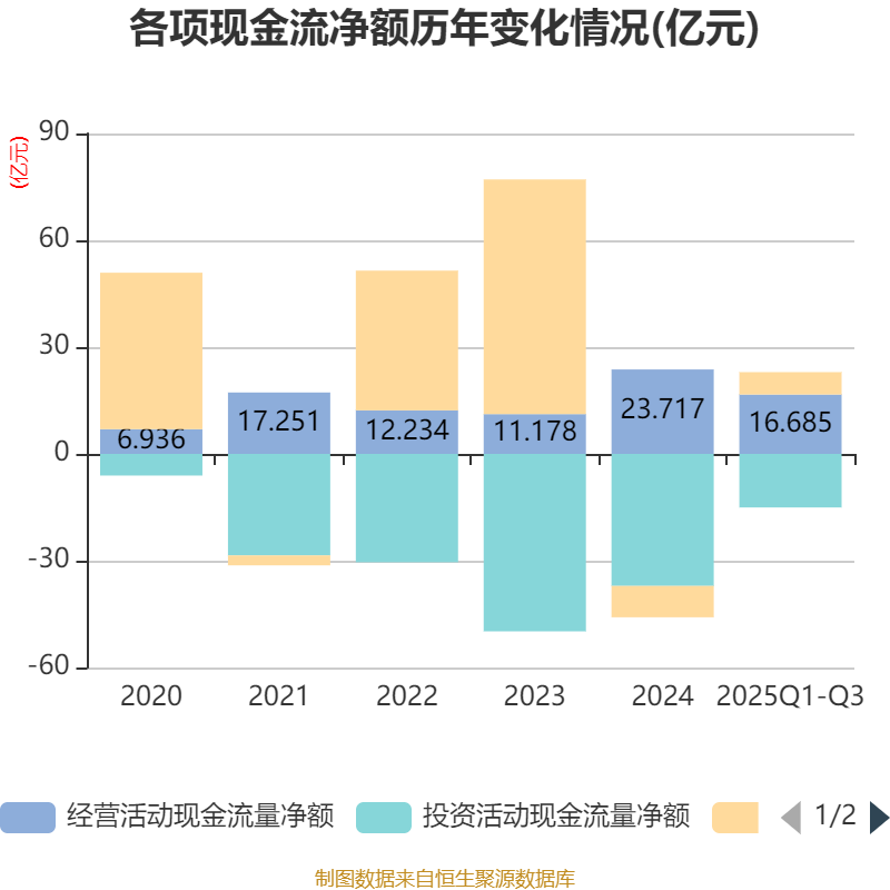 2025年前三季度,公司经营活动现金流净额为16.69亿元,同比增长55.14%;筹资活动现金流净额6.29亿元,同比增加9.42亿元;投资活动现金流净额-15.05亿元,上年同期为-25.62亿元。