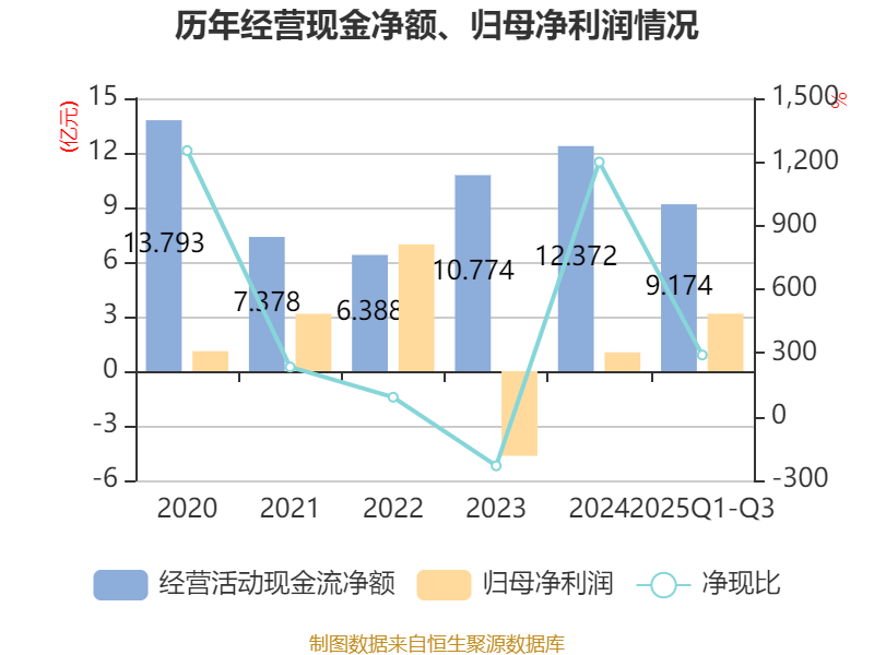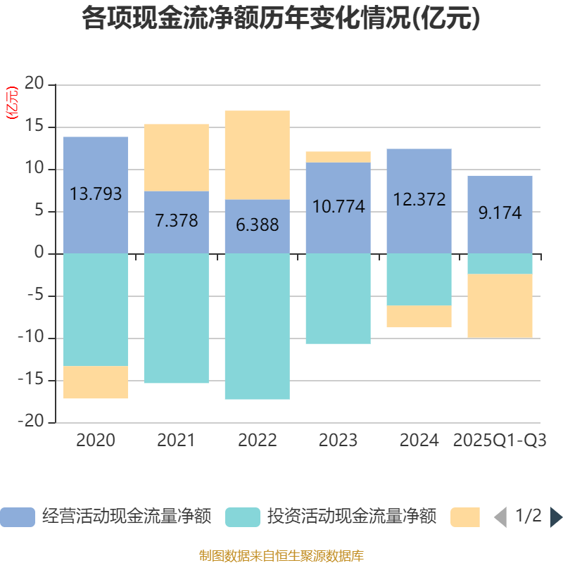 2025年前三季度,公司经营活动现金流净额为9.17亿元,同比下降0.6%;筹资活动现金流净额-7.51亿元,同比减少8.25亿元;投资活动现金流净额-2.46亿元,上年同期为-4.75亿元。