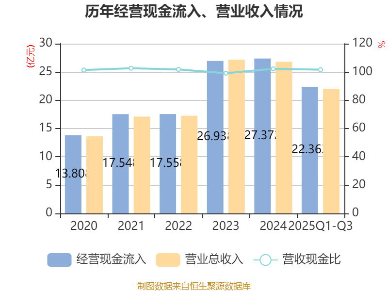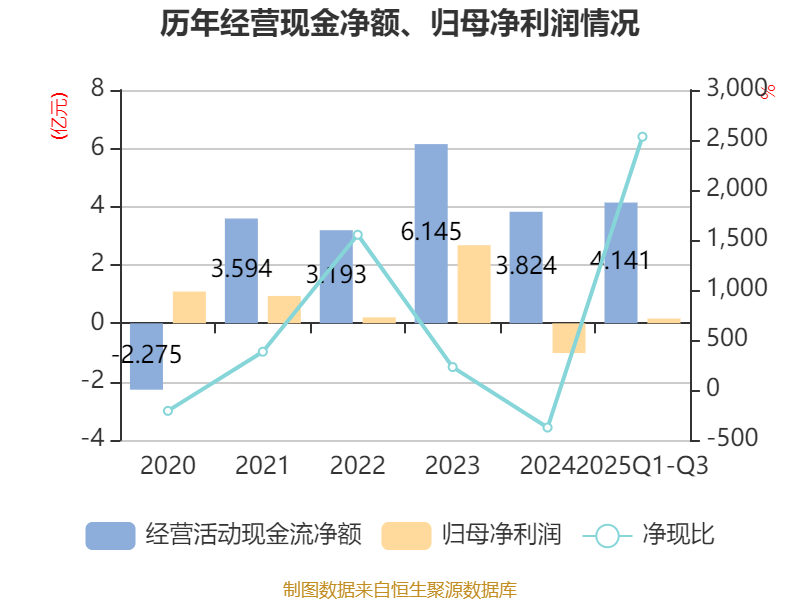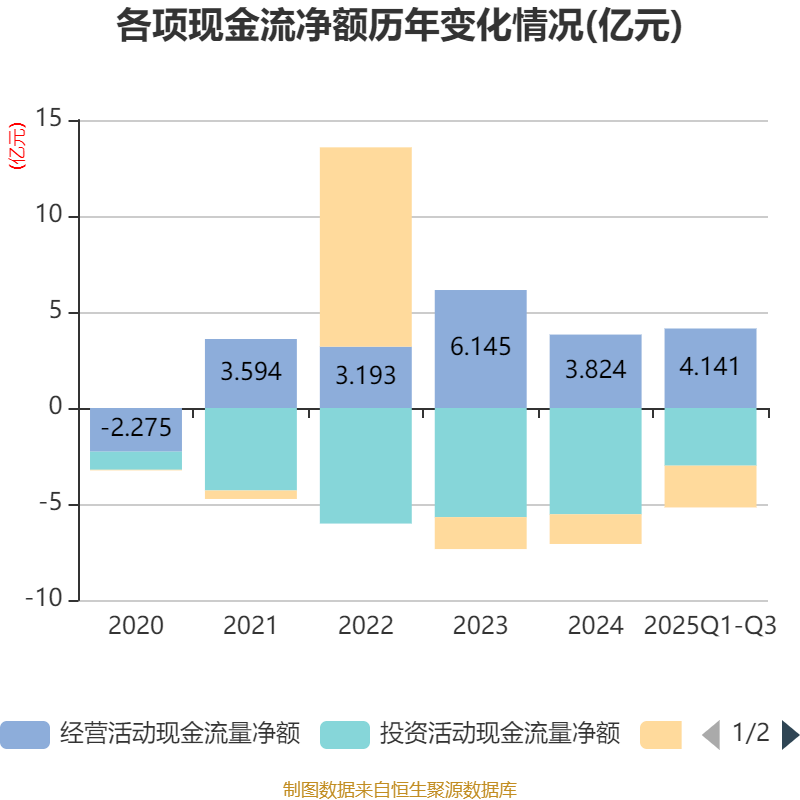 2025年前三季度,公司经营活动现金流净额为4.14亿元,同比下降0.08%;筹资活动现金流净额-2.18亿元,同比减少9063.75万元;投资活动现金流净额-3亿元,上年同期为-6.13亿元。