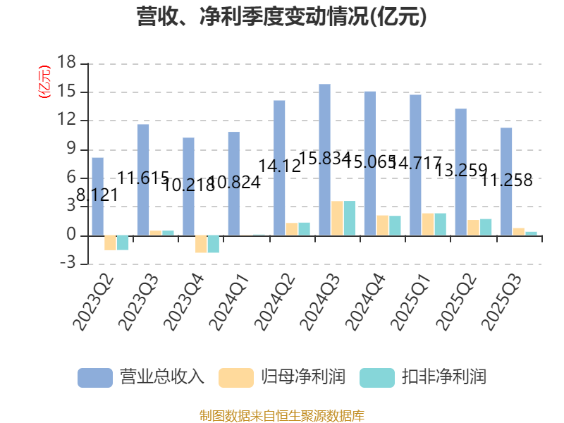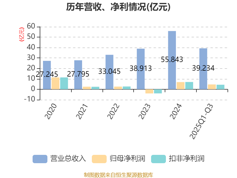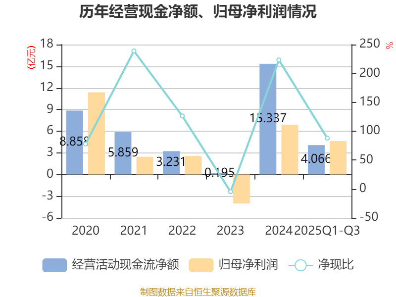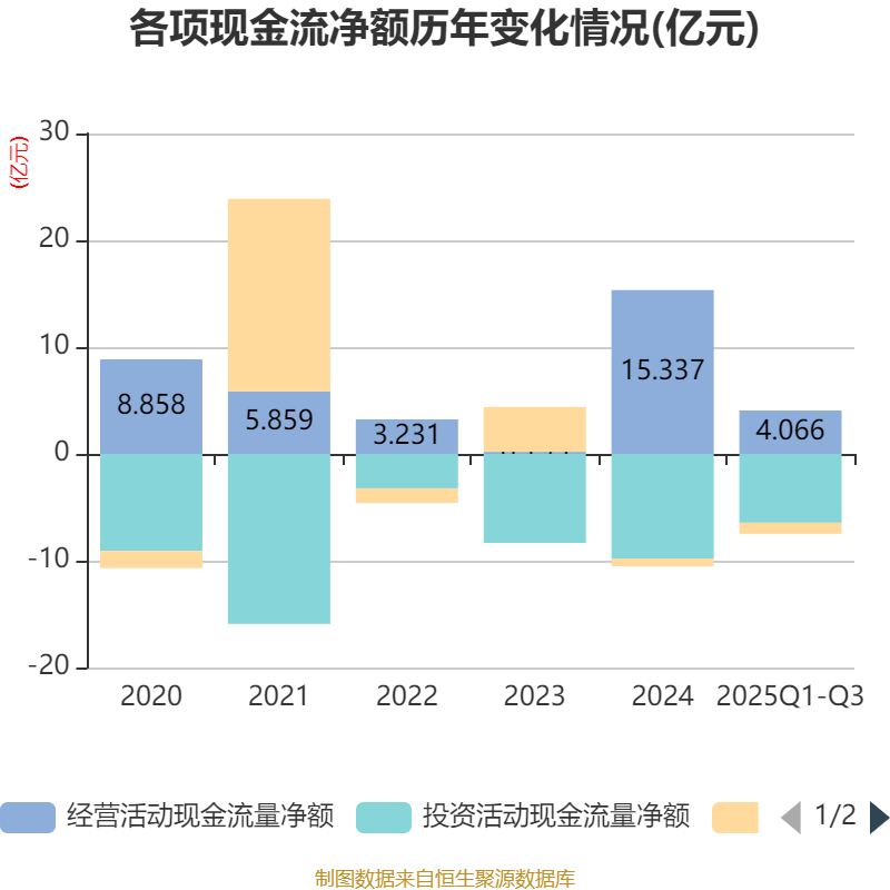 2025年前三季度,公司经营活动现金流净额为4.07亿元,同比下降51.89%;筹资活动现金流净额-1.04亿元,同比减少1.08亿元;投资活动现金流净额-6.44亿元,上年同期为-4.77亿元。