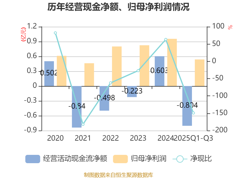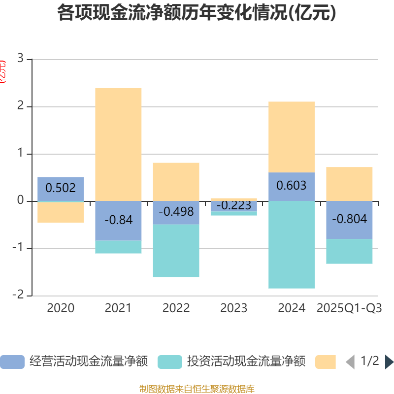 2025年前三季度,公司经营活动现金流净额为-8036.93万元,同比减少7377.68万元;筹资活动现金流净额7171.5万元,同比减少7441.19万元;投资活动现金流净额-5251.66万元,上年同期为-1.4亿元。