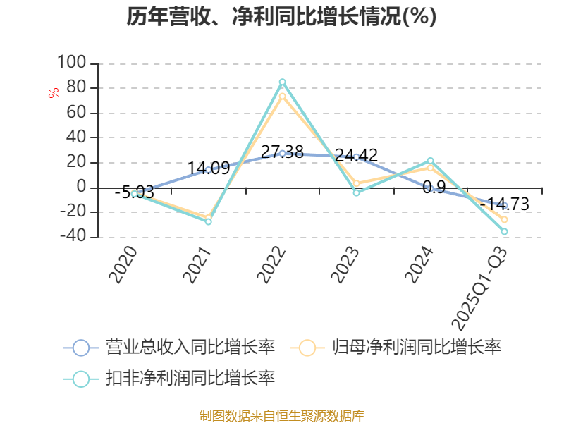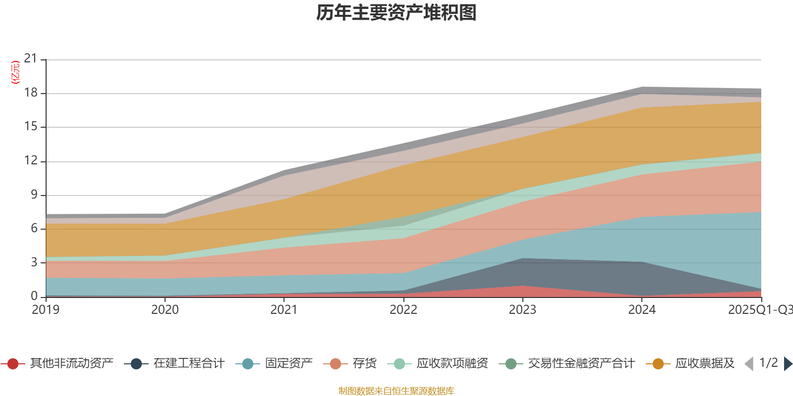 资产重大变化方面,截至2025年三季度末,公司固定资产较上年末增加70.99%,占公司总资产比重上升15.46个百分点;在建工程合计较上年末减少93.16%,占公司总资产比重下降15.06个百分点;货币资金较上年末减少66.53%,占公司总资产比重下降4.26个百分点;存货较上年末增加18.94%,占公司总资产比重上升4.04个百分点。