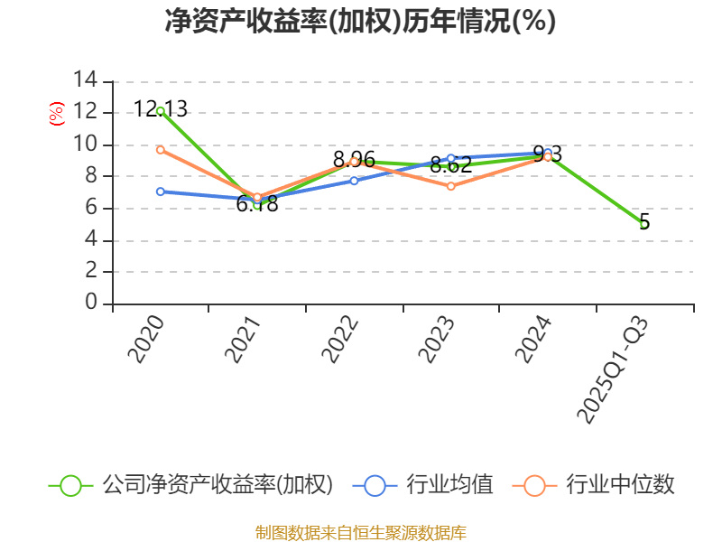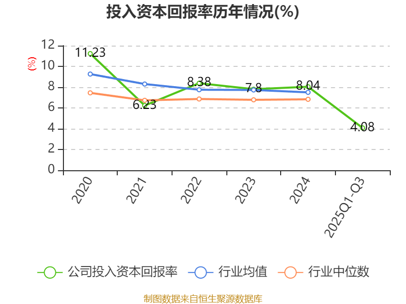盈利能力方面, 2025年前三季度公司加权平均净资产收益率为5%,同比下降2.15个百分点。公司2025年前三季度投入资本回报率为4.08%,较上年同期下降2.08个百分点。