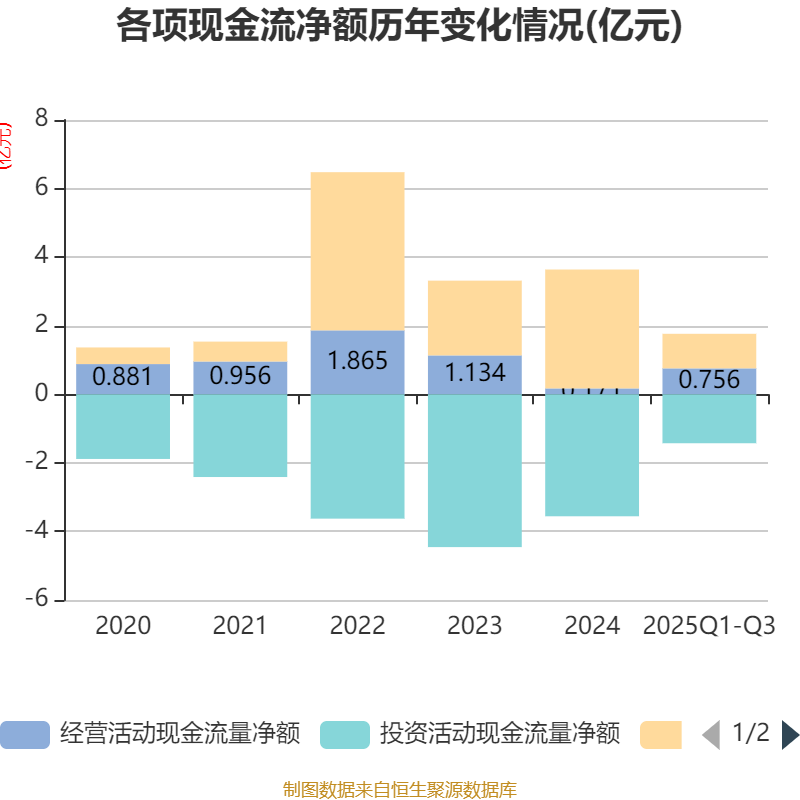 2025年前三季度,公司经营活动现金流净额为7555.84万元,同比增长26.28%;筹资活动现金流净额1.01亿元,同比减少3.3亿元;投资活动现金流净额-1.43亿元,上年同期为-3.36亿元。