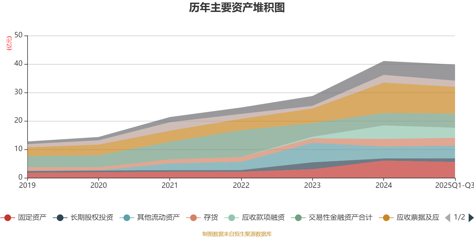 资产重大变化方面,截至2025年三季度末,公司应收款项融资较上年末减少25.74%,占公司总资产比重下降2.71个百分点;应收票据及应收账款较上年末减少11.89%,占公司总资产比重下降2.37个百分点;交易性金融资产合计较上年末增加13.67%,占公司总资产比重上升1.84个百分点;长期股权投资较上年末增加70.36%,占公司总资产比重上升1.35个百分点。