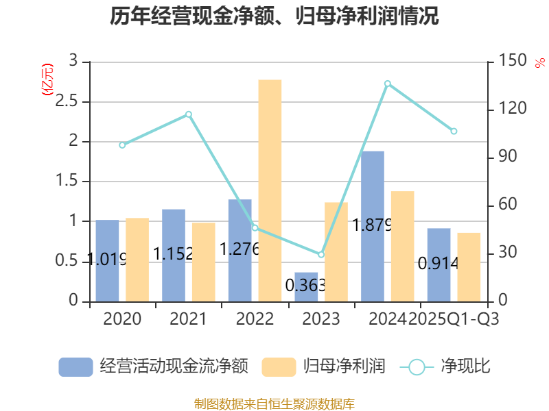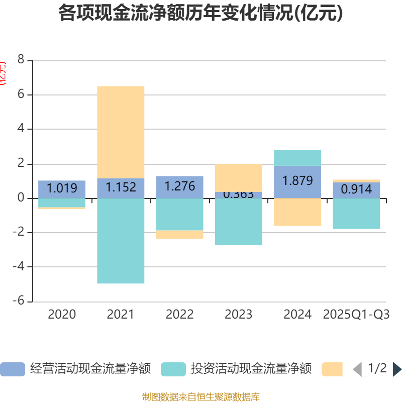 2025年前三季度,公司经营活动现金流净额为9135.41万元,同比增长51.4%;筹资活动现金流净额1584.88万元,同比增加1.13亿元;投资活动现金流净额-1.79亿元,上年同期为1.61亿元。