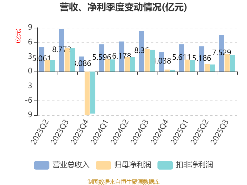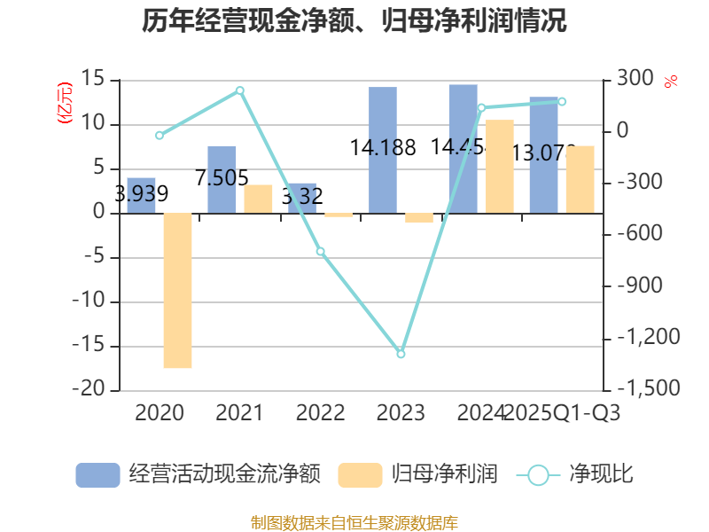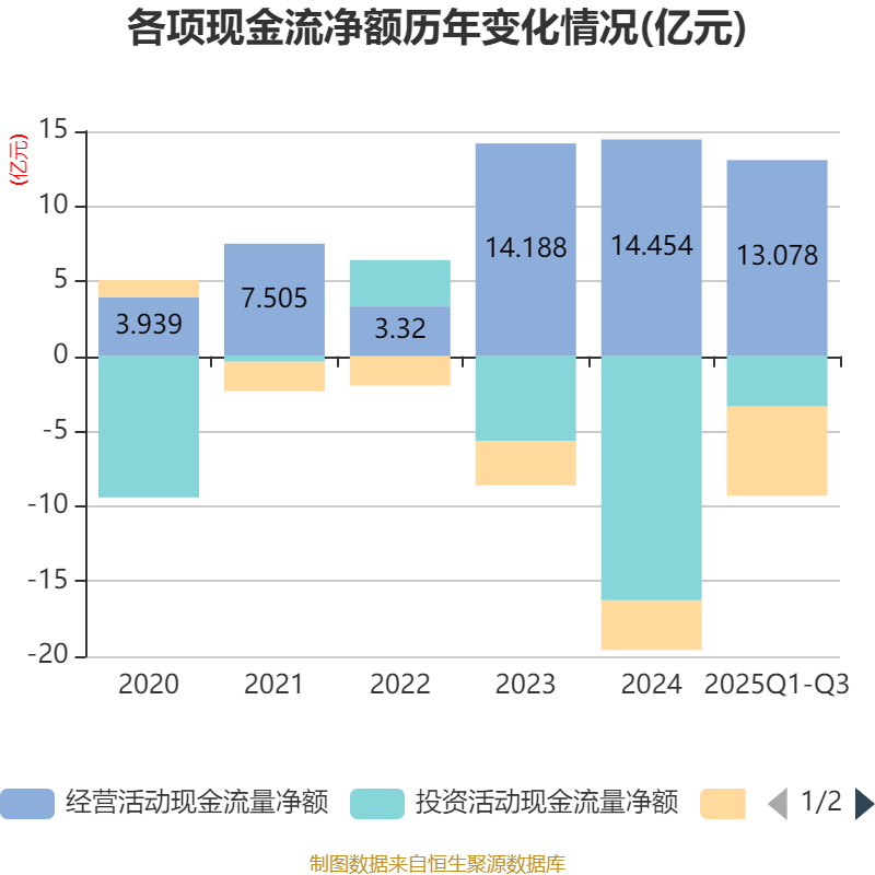 2025年前三季度,公司经营活动现金流净额为13.08亿元,同比下降0.95%;筹资活动现金流净额-5.94亿元,同比减少2.75亿元;投资活动现金流净额-3.35亿元,上年同期为-2.07亿元。