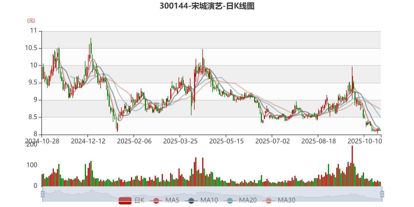 中证智能财讯宋城演艺(300144)10月28日披露2025年第三季度报告。前三季度公司实现营业总收入18.33亿元,同比下降8.98%;归母净利润7.54亿元,同比下降25.22%;扣非净利润7.26亿元,同比下降26.94%;经营活动产生的现金流量净额为13.08亿元,同比下降0.95%;报告期内,宋城演艺基本每股收益为0.2875元,加权平均净资产收益率为9.06%。