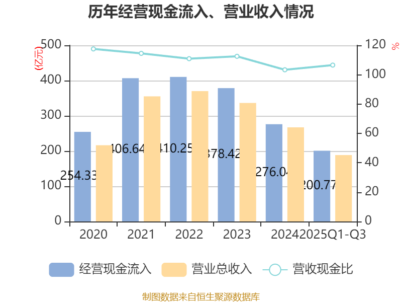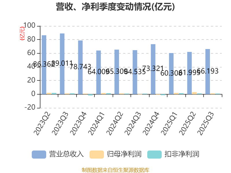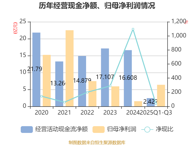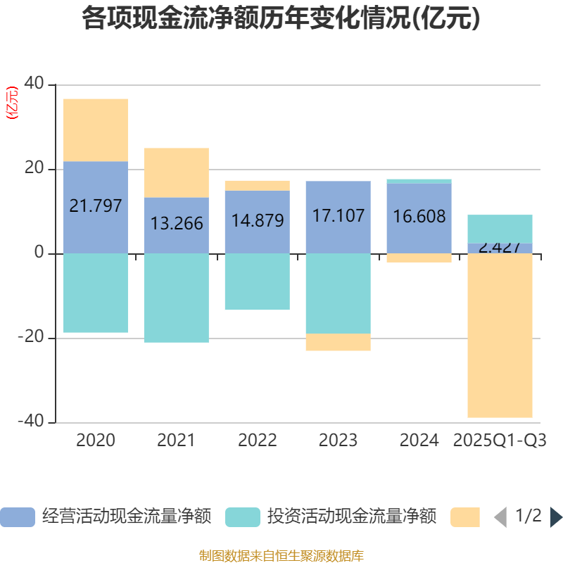 2025年前三季度,公司经营活动现金流净额为2.43亿元,同比下降43.3%;筹资活动现金流净额-38.93亿元,同比减少33.59亿元;投资活动现金流净额6.72亿元,上年同期为-2.14亿元。
