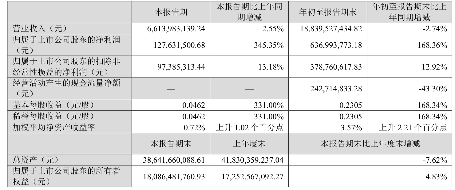 中证智能财讯传化智联(002010)10月28日披露2025年第三季度报告。前三季度公司实现营业总收入188.5亿元,同比下降2.76%;归母净利润6.37亿元,同比增长168.36%;扣非净利润3.79亿元,同比增长12.92%;经营活动产生的现金流量净额为2.43亿元,同比下降43.30%;报告期内,传化智联基本每股收益为0.2305元,加权平均净资产收益率为3.57%。